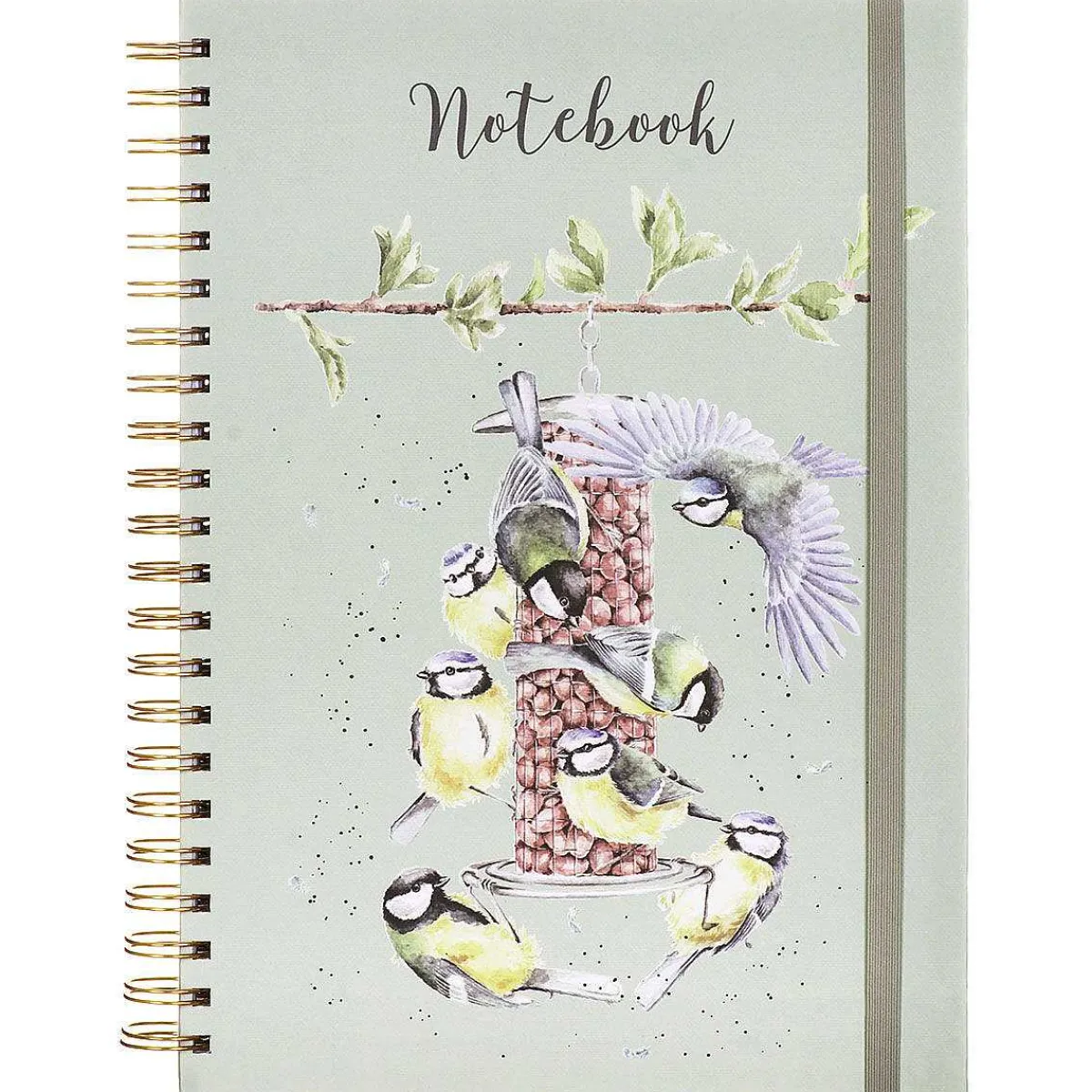 Set Against A Beautiful Sage Green Background, The Front Of This Notebook Is Decorated With One Of Hannah Dales Beautiful Illustrations, ‘Bon Appétit’. This Design Depicts A Bird Feeder Hanging From A Branch Filled With Bird Food. Surrounding The Feeder Is A Flock Of Garden Birds Including Blue Tits And Great Tits All Trying To Get A Quick Snack! The Design Is Painted In The Soft Watercolour Style Of Artist Hannah Dale, Depicted With Intricate Detail And Surrounding The Illustration Are Speckles Of Black Paint, In A Way That Is Synonymous With The Wrendale Brand. The Back Cover Features A Wonderful Illustration Of A Blue Tit In Flight With Its Wings Spread.