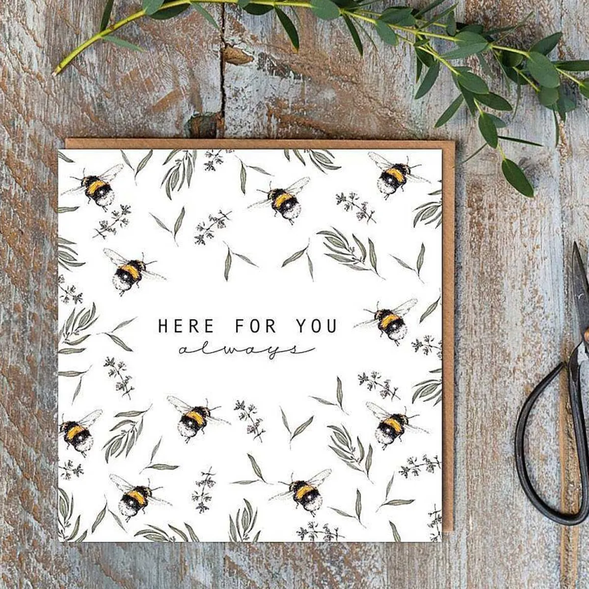Inspired By The British Countryside, The Front Of This Charming Card Is Decorated With A Pattern Of Dainty Bumblebees And An Assortment Of Botanicals Depicted In Watercolour On A Crisp White Backdrop. The Words ‘Here For You Always’ Appear In The Centre.