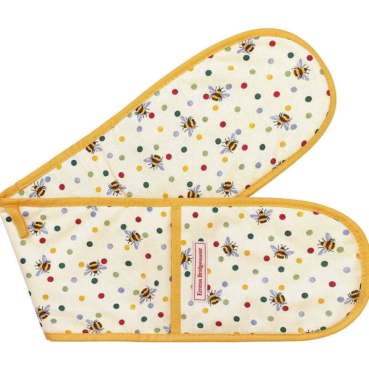 The Oven Glove Is Adorned With The Small Polka Dot Design, Sponge Printed Multicoloured Spots Interspersed With The Iconic Insect Pattern Of Bumblebees With A Yellow And Black Body. The Oven Glove Is Made From Cotton And Is A Soft Cream In Colour, Creating A Wonderful Base For The Design.
