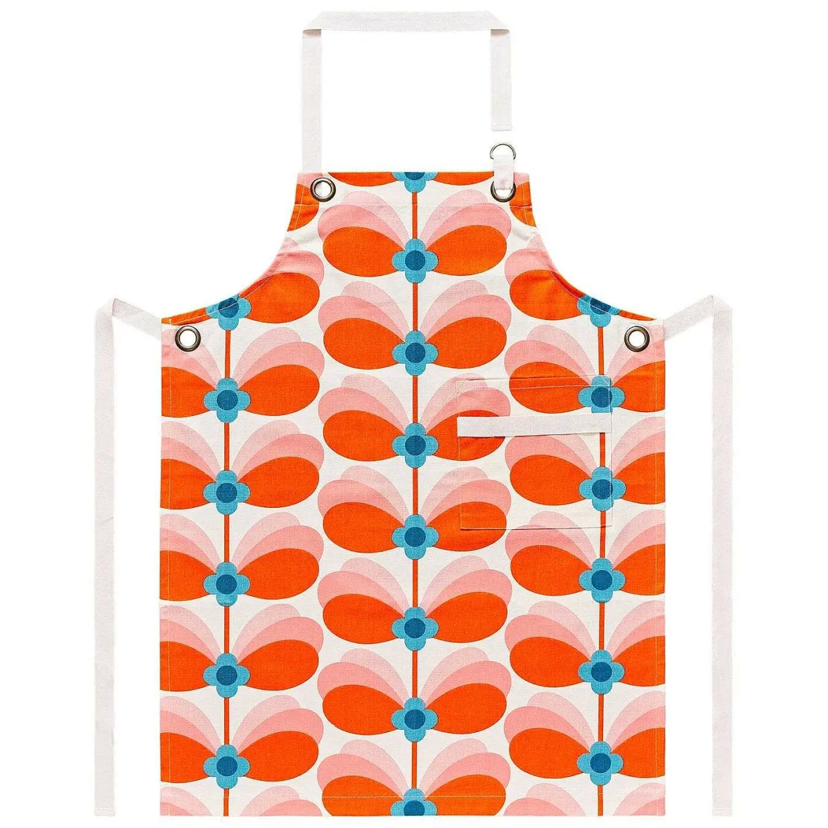 This Apron Features The ‘Butterfly Stem’ Print; Vibrant Leaves Which Are Overlapped Fading From Vibrant Orange To Pale Peach. Each Set Of Overlapping Leaves Are Attached To The Stem With A Simple Four Petal Blue Flower. The Pattern Is Repeated In A Linear Fashion Across The Apron On A Cream Background. The Apron Is Made From 100% Cotton And Has An Adjustable Neck Strap And Waste Ties. There Is A Handy Breast Pocket Which Allows You To Keep A Pencil And Paper At Hand For Making Cooking Notes.
