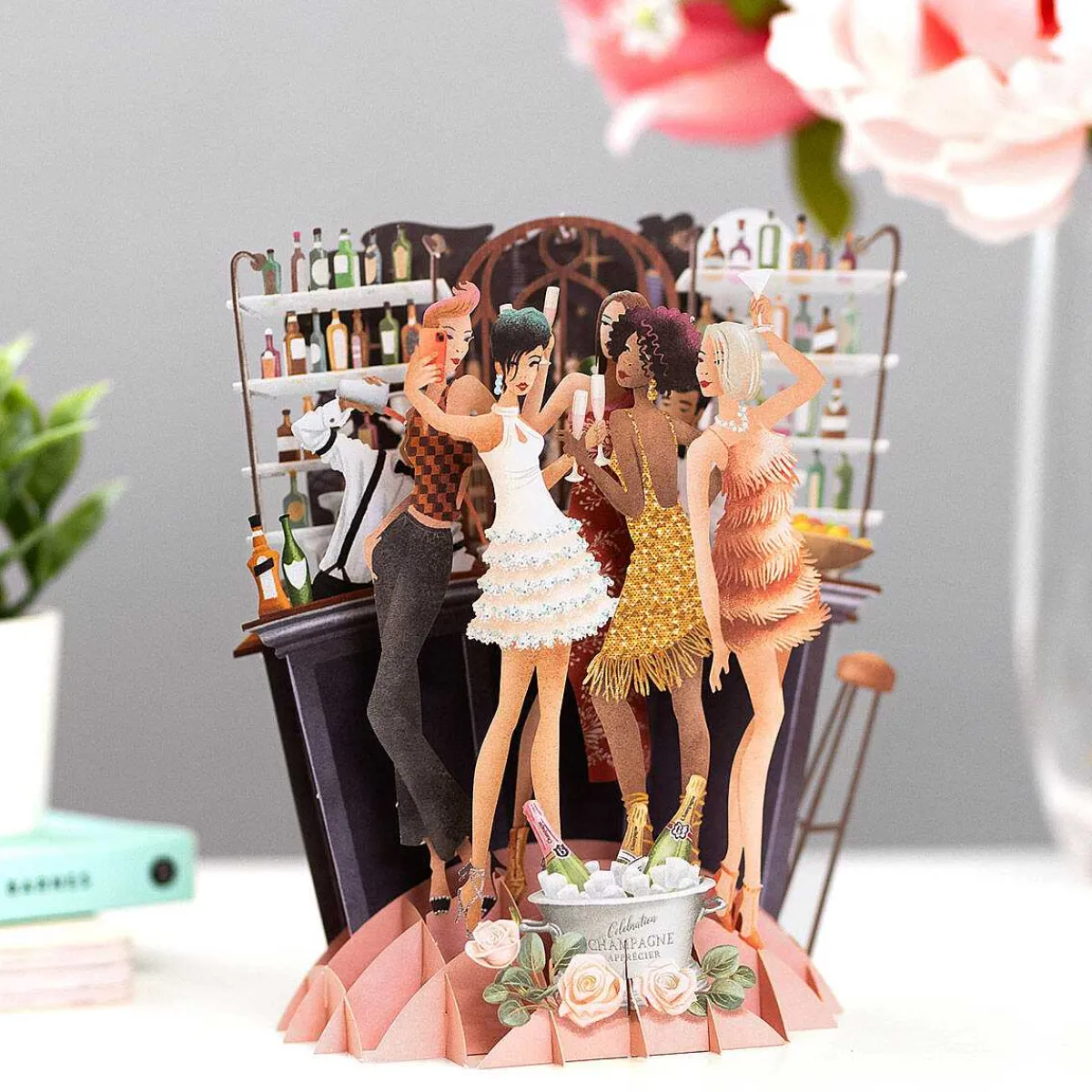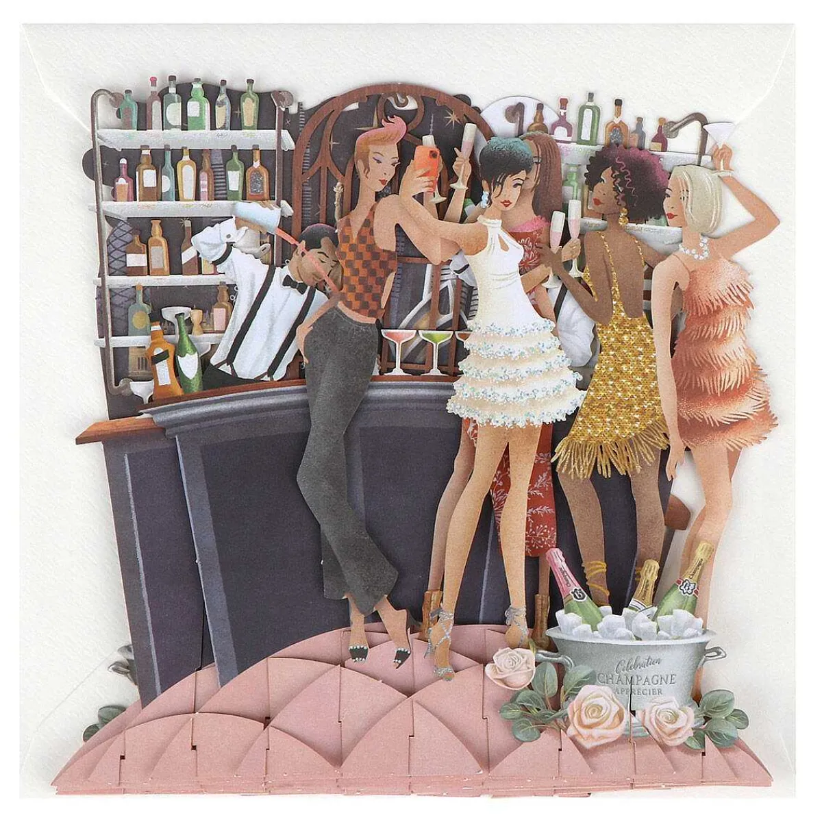 The Popup 3D Card Is Beautifully Designed With Laser Cut, Intricate Details Bringing It To Life. It Depicts An Art Deco Style Cocktail Bar Featuring An Assortment Of Colourful Drinks Bottles, With Two Smartly Dressed Mixologists Serving Up Drinks. A Group Of Glamorous Women Wearing Cocktail Dresses Pose For A Photo Whilst They Drink Champagne And Celebrate Together.