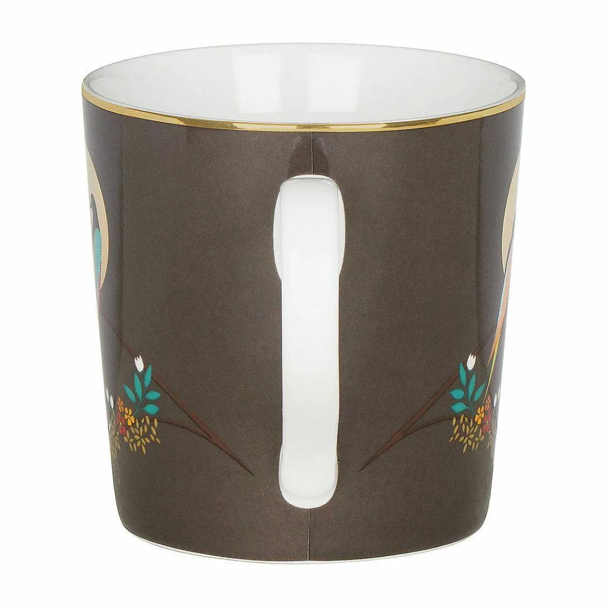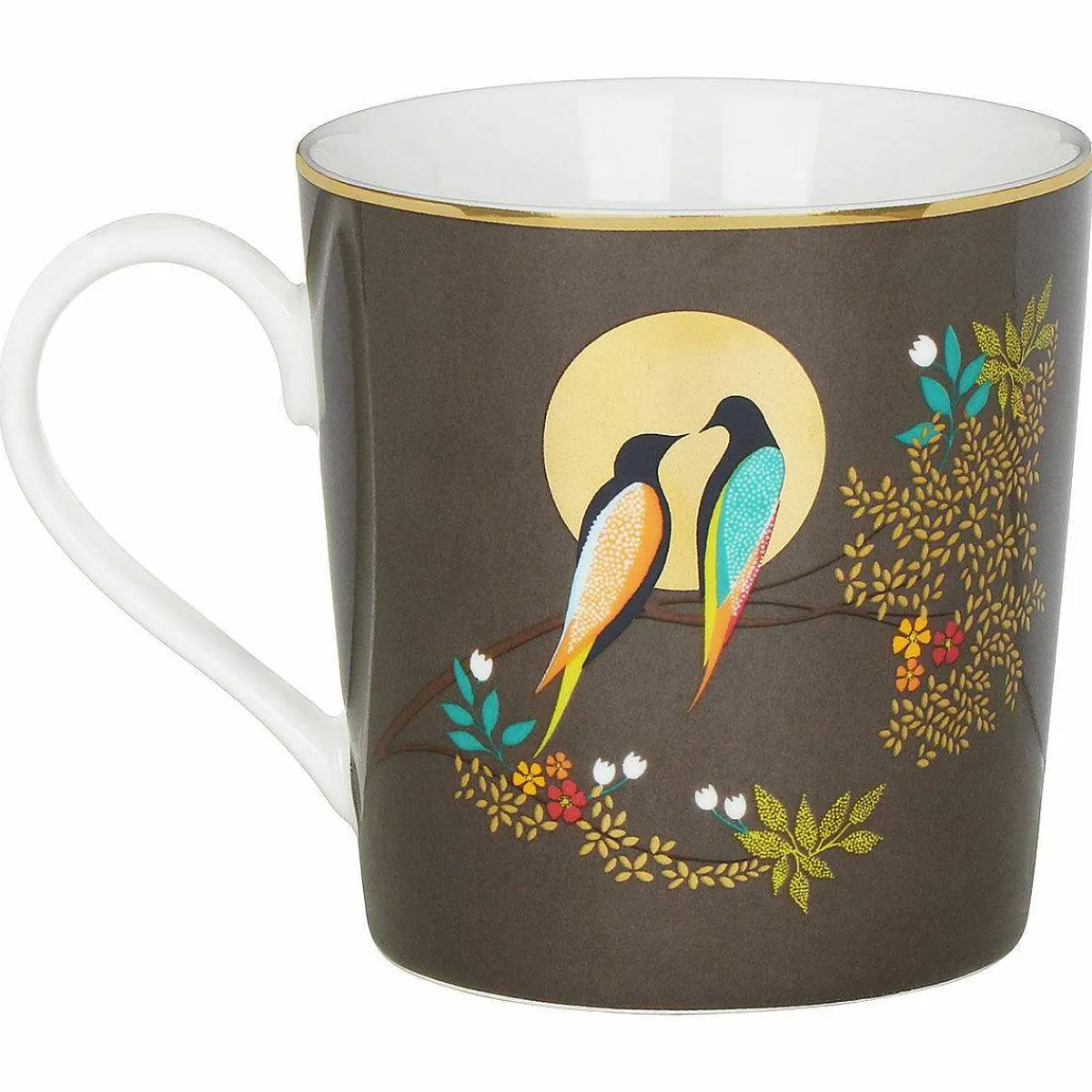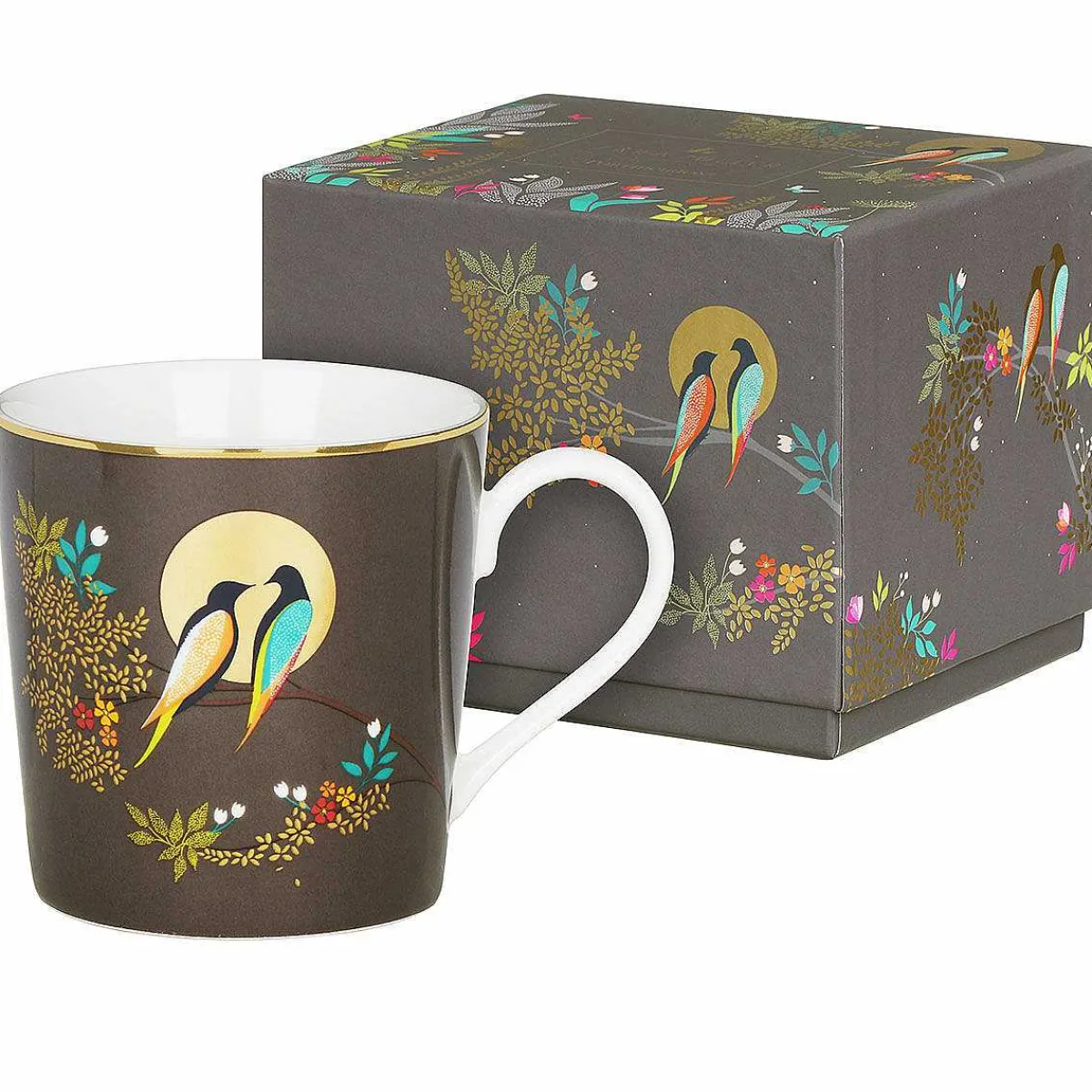 Set Against A Dark Grey Background, The Mug Is Decorated With A Branch That Curves Across The Face Of The Mug And Is Laden With Golden Leaves And Colourful Flowers. Two Birds Are Depicted Perching On The Branch, Looking Lovingly At Each Other In Front Of A Golden, Shining Moon. Their Bodies Are A Deep Navy, Whilst Their Wings And Tails Contrast In Stunning Shades Of Blue, Yellow And Orange. The Handle And The Inside Wall Of The Mug Are Left Blank Which Provides A Nice Contrast To The Bold Print. The Gold Trim Around The Top Of The Mug And Moons Are Embellished With 22 Carat Gold Leaf For A Decadent And Stylish Finish.