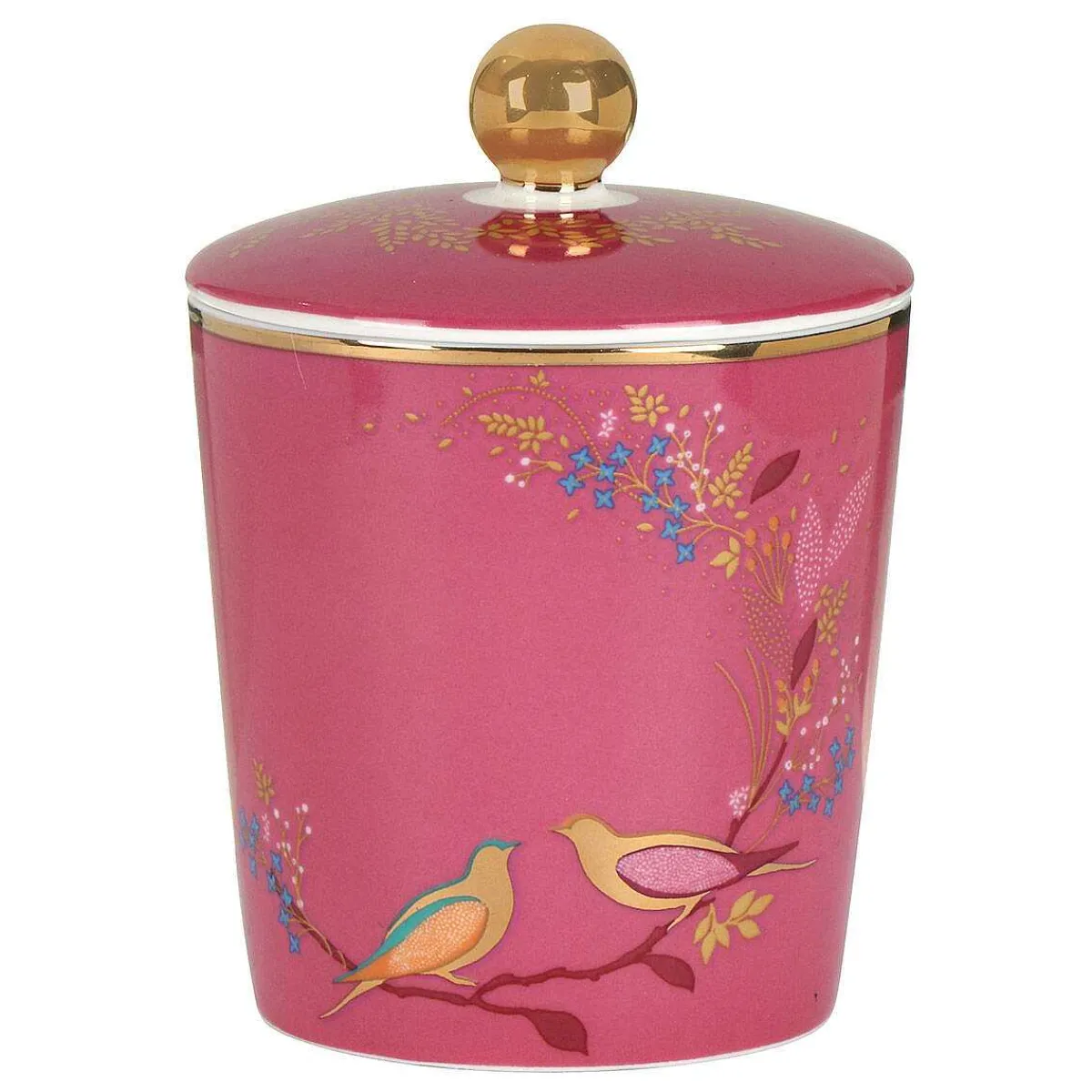 The Beautiful Fragranced Coconut Wax Candle Comes In A Ceramic Jar Which Features An Exquisite Chelsea Design From Sara Miller; Two Colourful Lovebirds Sit Upon A Branch, The Branch Is Adorned With Delicate Florals And Golden Foliage Set Against A Vibrant Pink Background. The Sleek Jar Vessel Is Finished With 22 Carat Gold Details Including A Circle Around The Rim And Is Topped With A Lid Featuring A Golden Knob And Foliage Which Matches The Design Around The Edge Of The Vessel Completing The Sophisticated Piece Of Home Decor.