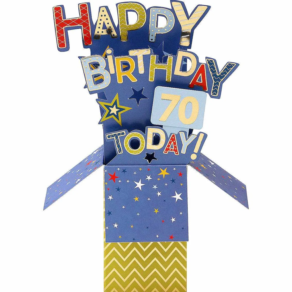 Unique And Fun In Its Design, Open Up This Card To Be Greeted By A Fantastic Paper Sculpture. The Design Features A Beautiful Blue Background With Text Across It That Reads ‘Happy Birthday 70 Today!’ In A Variety Of Bright And Colourful Prints. This Eye-Catching Card Is Embellished With Copper Foiling And The Design Emerges From A Yellow Box With Gold Foiled Zigzags.