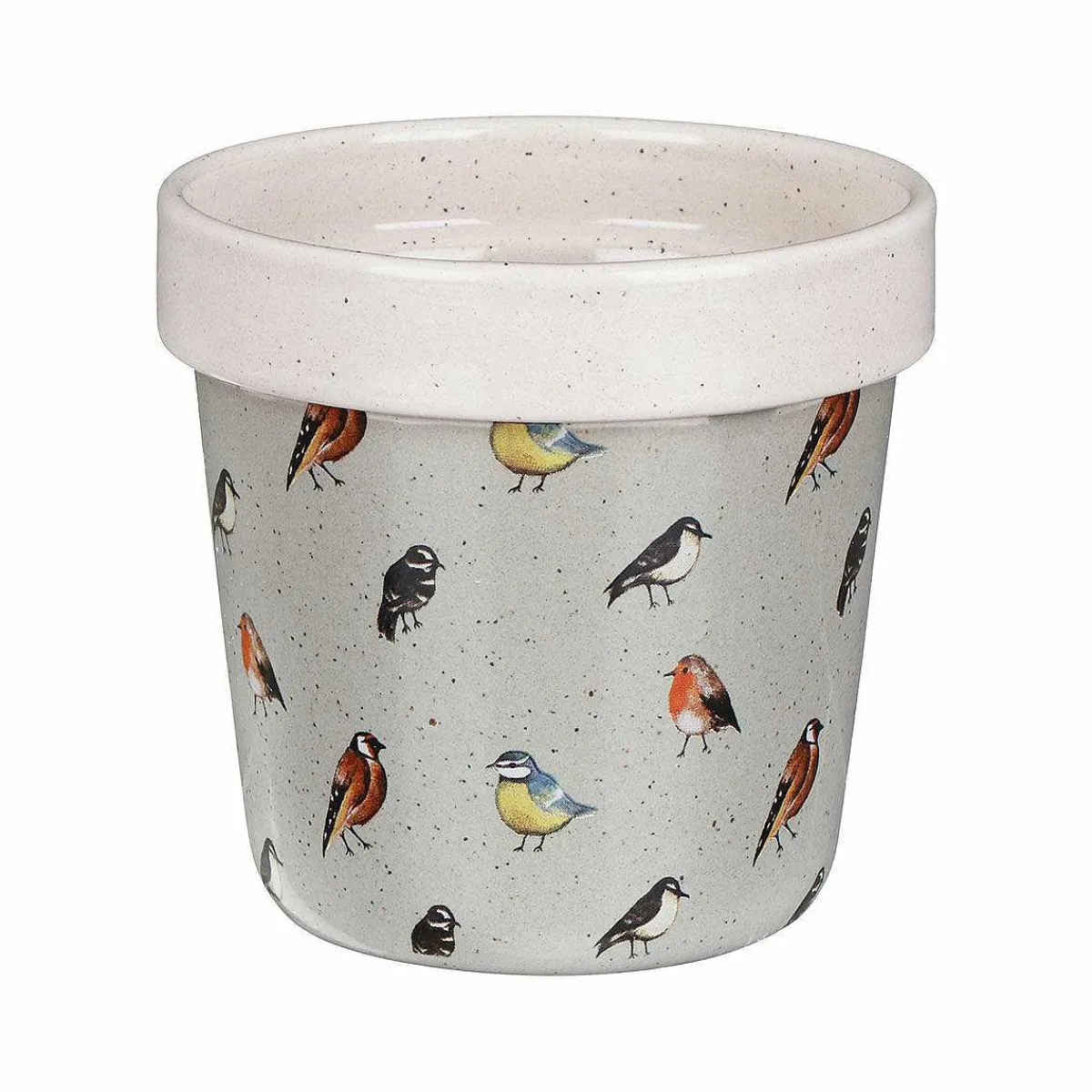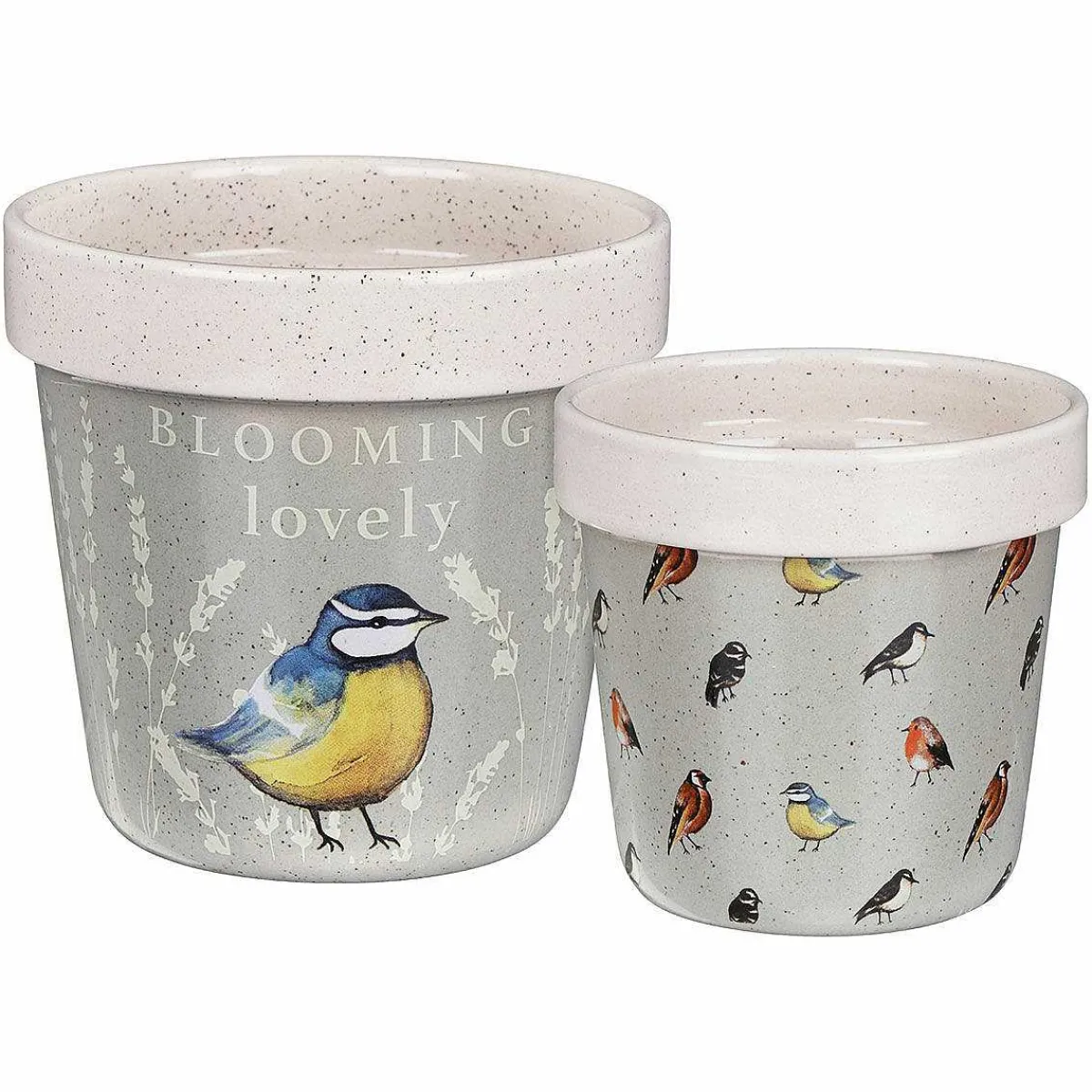 Made From Ceramics With A Speckled Cream Surface, With A Sage Green Base, Each Plant Pot Has A Different Design. The Large One Features A Single Blue Tit On Either Side With The Text ‘Blooming Lovely’ Above The Bird. The Smaller Plant Pot Features Blue Tits, Robins, Goldfinches And Other Garden Birds In A Repetitive Scattered Pattern, Complimenting The Large So They Can Be Displayed As A Pair Or Separately. The Smaller Plant Pot Fits Snuggly Inside The Larger One For Easier Storage When Not In Use.