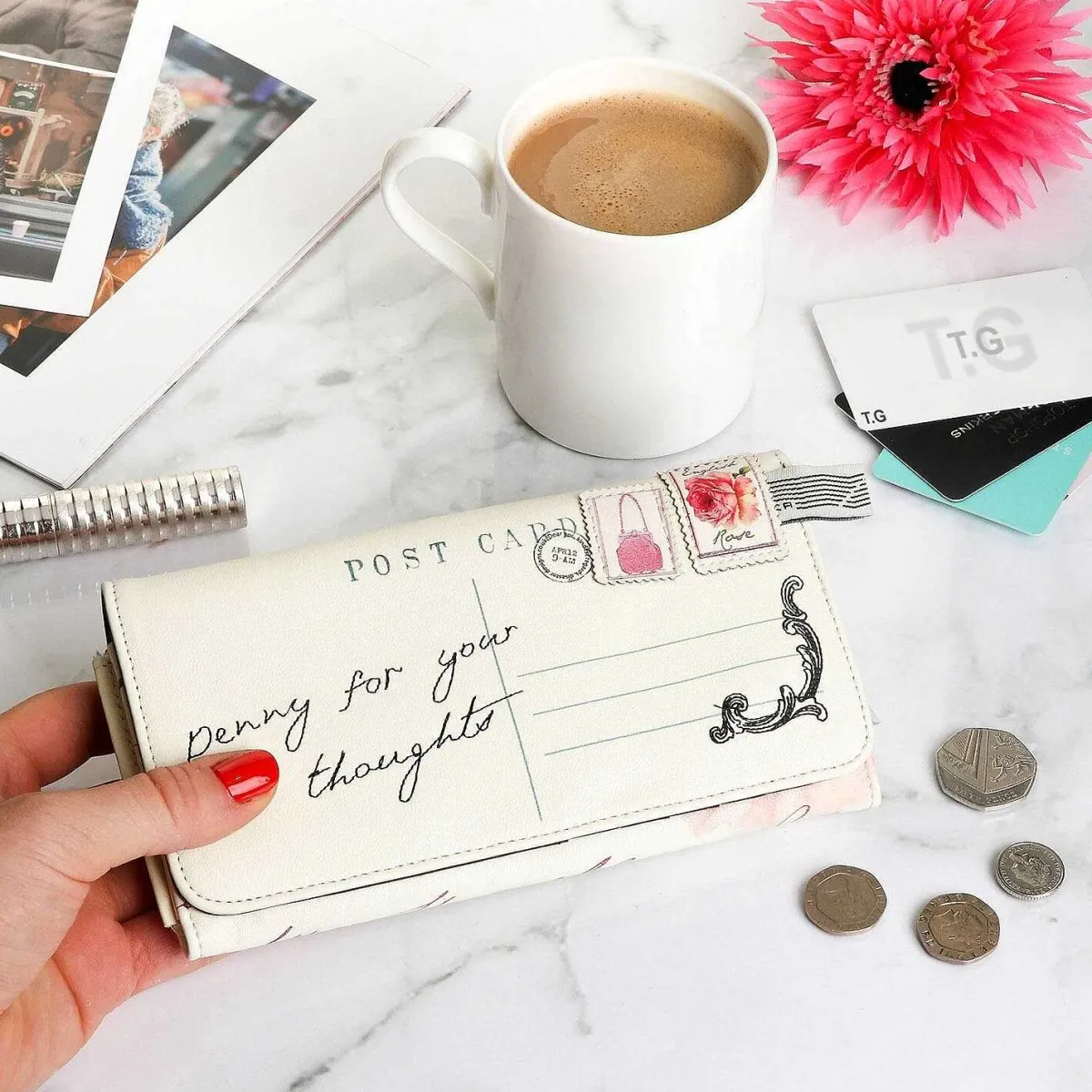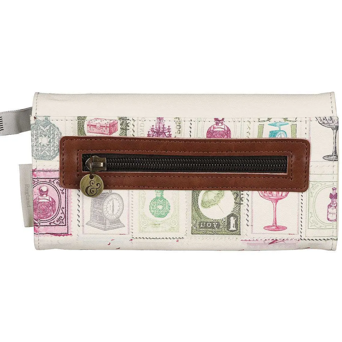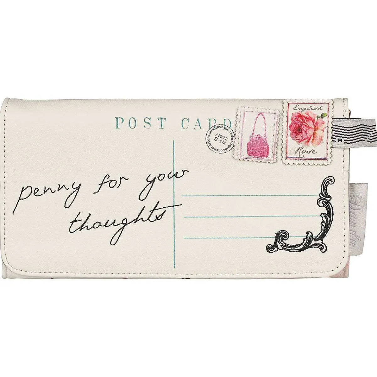 The Wallet Itself Is A Luscious Cream Colour In Exterior With Many A Design Imprinted Across The Front To Portray The Postal Theme. A Postcard Layout With The Script ‘Penny For Your Thoughts’ And Two Elegant Floral Based Embossed Stamps Make This Wallet Truly Unique And Original In Its Design. The Back Of The Wallet Features The Dandy Pastel Coloured Stamp Pattern, Elegantly Printed Behind A Leather-Look Zip Compartment With A Elegant Brass Zip Pull.