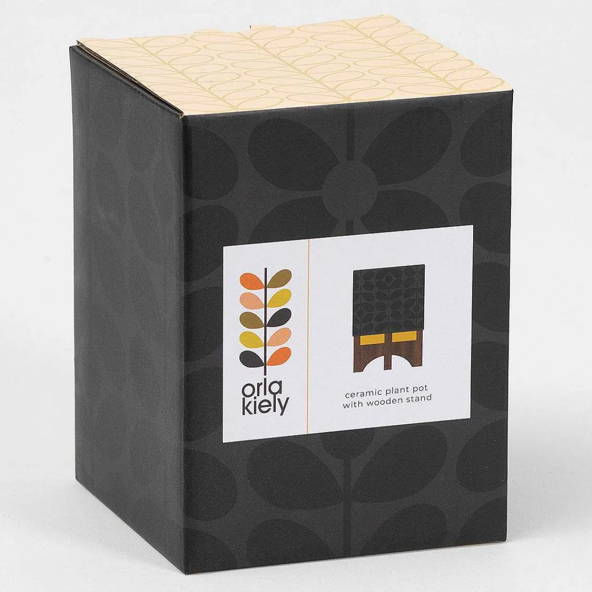 The Plant Pot Features The ‘Sixties Stem’ Design; Leaves Along A Stem Which Have Been Debossed Onto Ceramic. The Glossy Black Pot Features A Vibrant Yellow Stepped Base Which Allows It To Sit Neatly Onto Its Wooden Stand Which Raises It, Adding Another Dimension To The Retro Style.