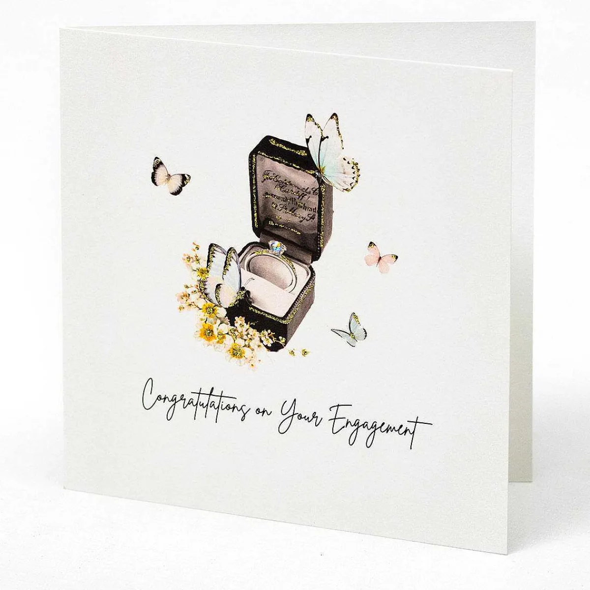 The Front Of This Wonderful Card Is Decorated A Black And White Illustration Of A Gorgeous Diamond Ring Which Is Nestled Inside A Jewellery Box, Surrounded By Fluttering Butterflies In Shades Of Pink And Blue. The Design Has Been Embellished By Hand With Glitter And Diamantes That Shimmer And Sparkle In The Light, With A Message On The Front That Reads, ‘Congratulations On Your Engagement’.