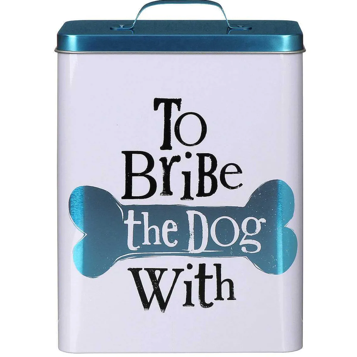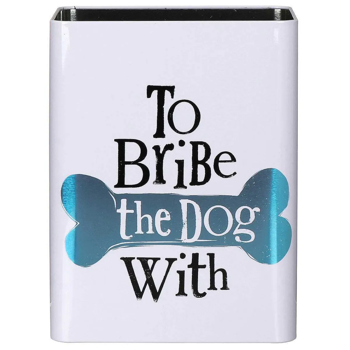 This Amusing Tin Is Designed With A Metallic Blue Bone With Writing Which Reads ‘To Bribe The Dog With’. On The Reverse Side Is An Array Of Metallic Bones With More Text That Reads ‘& Try Not To Accidentally Eat When Drunk’. The Tin Is Complete With A Metallic Blue Lid And Handle Which Securely Stores Treats Away From Hungry Pets!