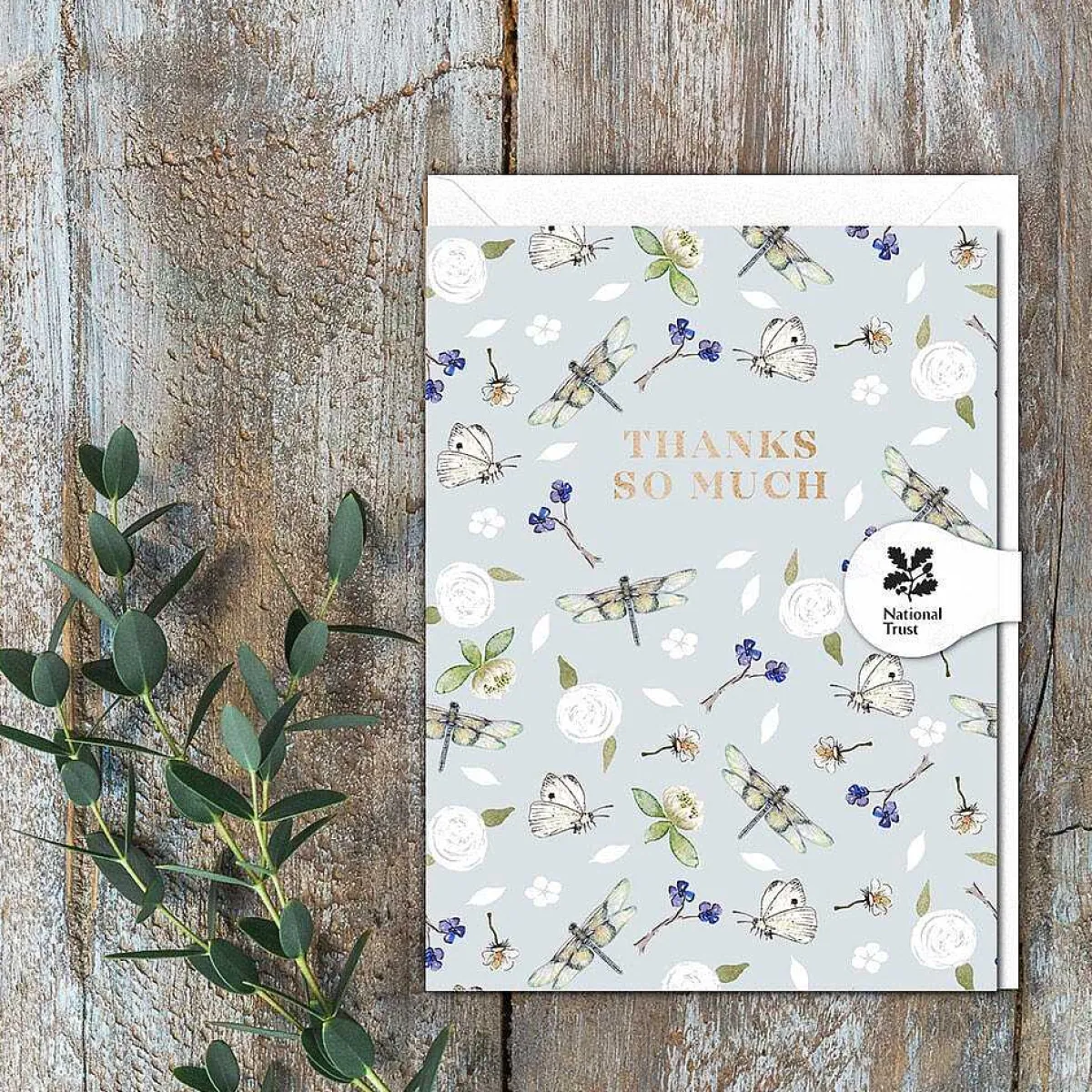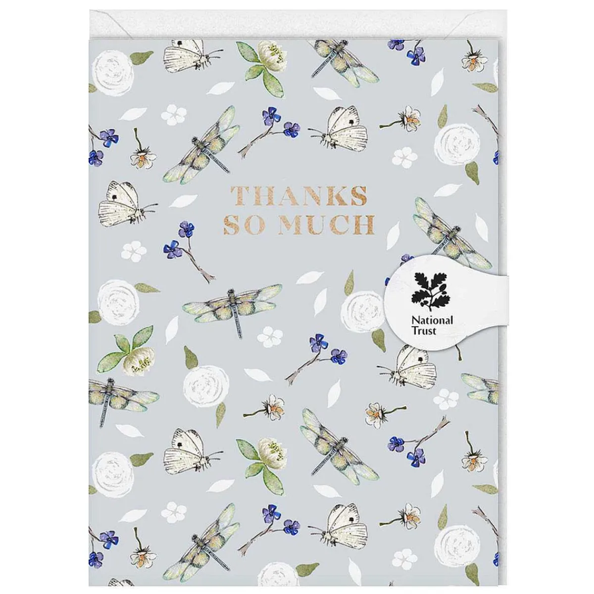 Inspired By The British Countryside, The Front Of This Card Is Decorated With Charming Watercolour Illustrations Of Dragonflies Surrounded By An Assortment Of Flowers And Butterflies, On A Subtle Blue Backdrop. The Words ‘Thanks So Much’ Are Debossed In Metallic Gold Text That Shimmers And Sparkles.