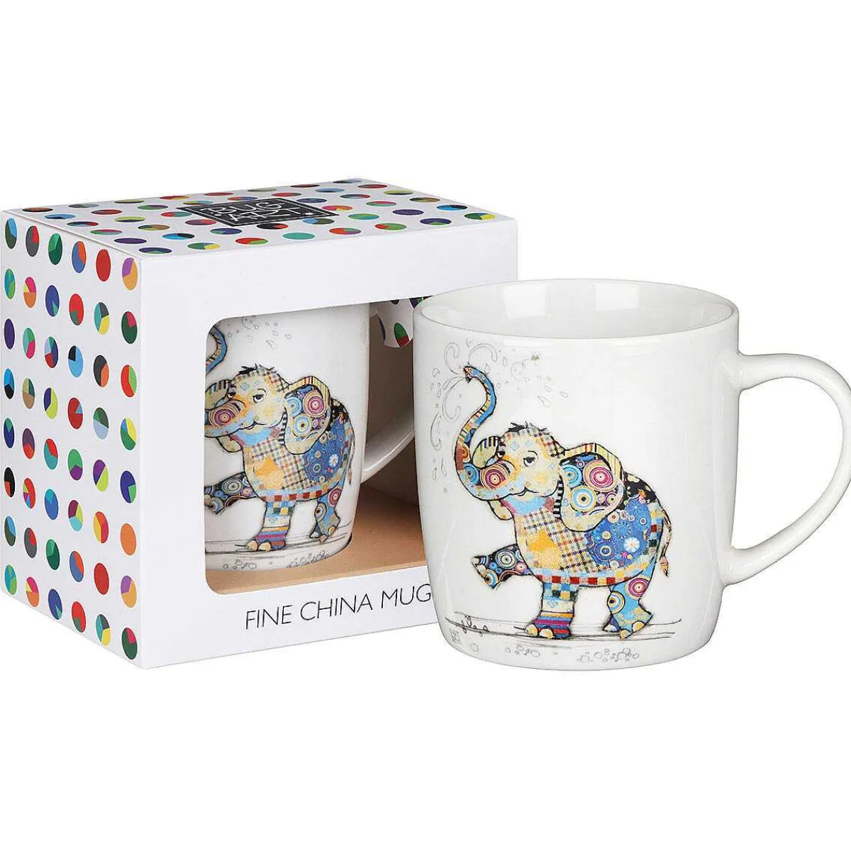 The Mug Is Made From Fine China And Has A Capacity Of 350Ml, More Than Enough Space To Hold Your Morning Coffee Or Afternoon Tea. The Front Of The Mug Features A Playful Design Of A Colourful Patchwork Elephant With Large Ears, A Long Trunk And Little Tail, And Is Playfully Spraying Water! The Motif Is Set Against A Crisp White Background Which Makes It Stand Out. The Image Is Repeated On The Back Allowing The Design To Be Enjoyed By Everyone.
