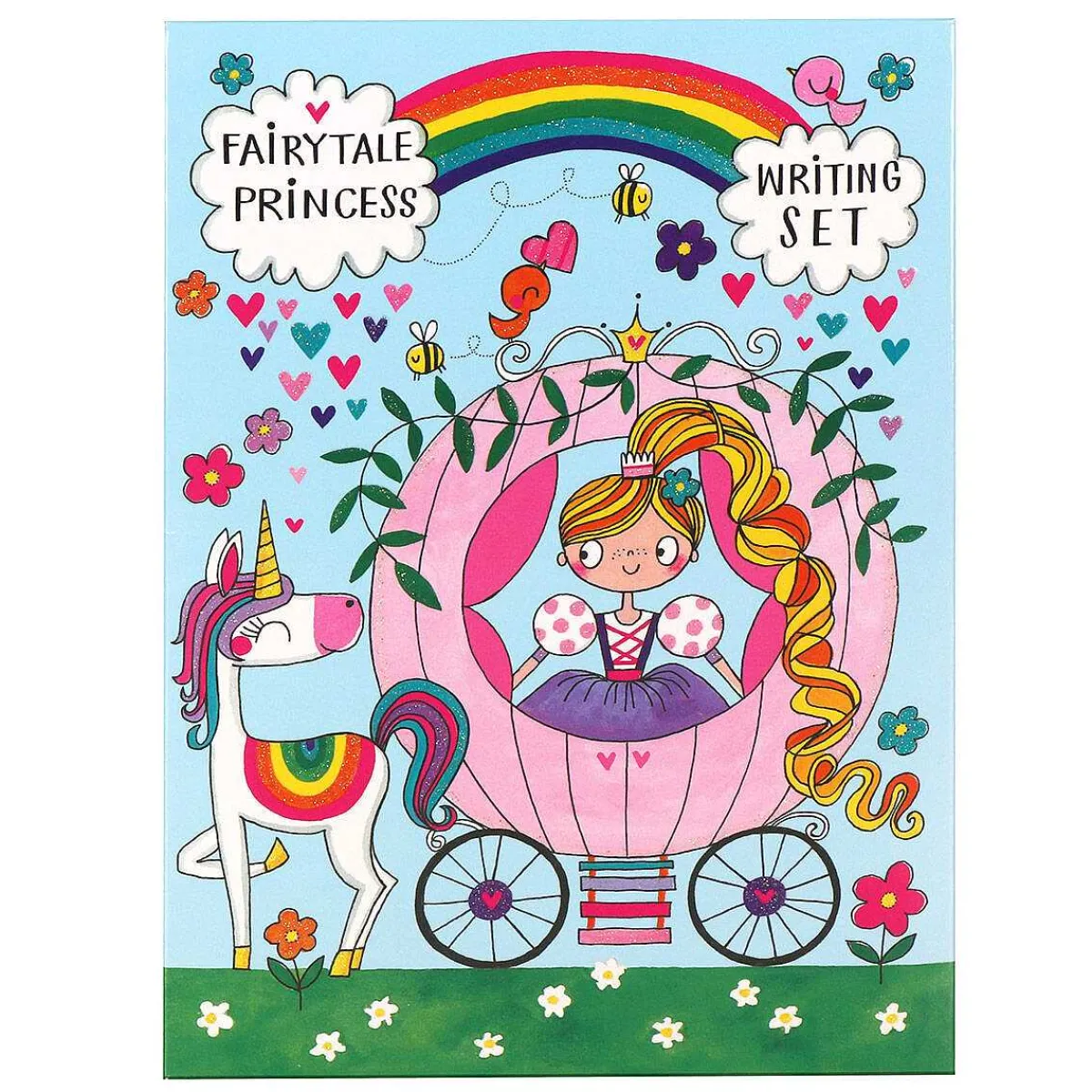 Each Sheet Of Writing Paper Is Pale Blue, And Across The Bottom Is A Colourful Illustration Of The Princess In Her Carriage With Unicorn, Along With The Fairy Tale Castle. Whilst The Envelope Features The Fairy Tale Princess In Her Carriage With Unicorn, And A Rainbow In The Opposite Corner With Space In The Middle For You To Write The Address. The Front Of The Writing Set Features A Princess With Long Flowing Hair, In A Pink Carriage With A Unicorn, Each One With A Cute And Adorable Character. The Characters Are Surrounded By Hearts, Flowers And A Rainbow, With Bees And Birds Which Add Interest To The Playful Design. The Slogan On The Front Reads ‘Fairy Tale Princess’ And A Rainbow With Clouds At Each End, Which Reads ‘Writing Set’. On The Reverse Of The Pack The Design Continues With The Same Theme.