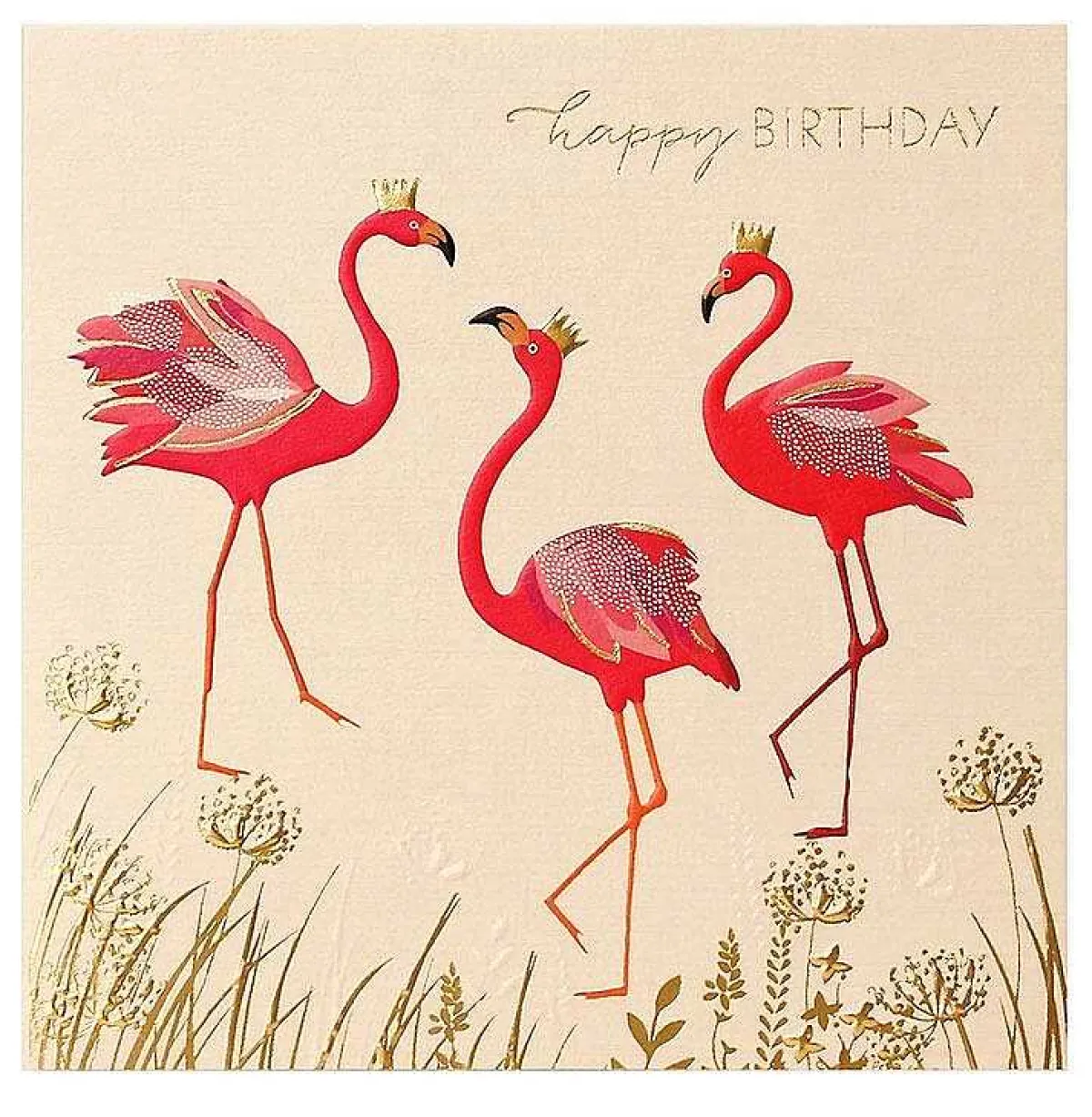 This Gorgeous Gold Foiled Greeting Card From Sara Miller Features A Trio Of Elegant Pink Flamingos, Each Wearing A Golden Crown. The Flamingos Have Deep Pink Bodies And Long Orange Legs And They Pick Their Way Like Fragile Ballerinas Through Gold And White Grasses Against A Pale Cream Background.
