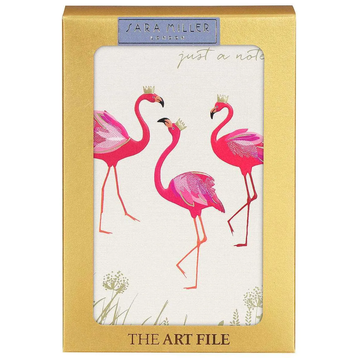 This Set Of 10 Notecards From Sara Miller Are Beautifully Embellished With Flamboyant Flamingos Wearing Gold Crowns, Surrounded With Gold Foliage On A Textured Cream Background. The Words ‘Just A Note’ Are Written On The Front In A Stylish Gold Font.
