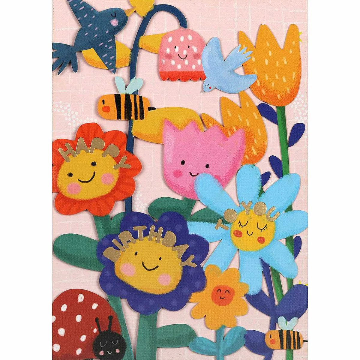 Featuring A Selection Of Colourful Flowers, This Card Is Sure To Be Loved By Girls Of All Ages. Birds, Bees, And Ladybugs Flutter Amongst The Smiling Garden Flowers, On A Patterned Pink Backdrop. The Words, ‘Happy Birthday To You’, Are Written On The Front Of The Card In Shimmering Gold Text.