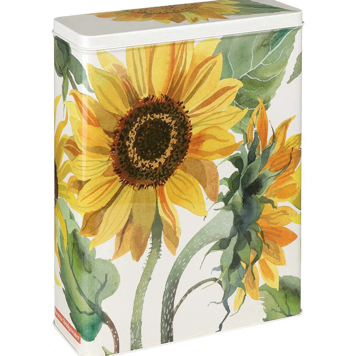 This Summery Illustration Depicts Magnificent Sunflowers With Gorgeous Details, Complete With Distinctive Large Centres, Multiple Petals Along With Green Leaves And Sepal. The Design Continues On The Lid With Part Of A Sunflower Displayed. These Colourful Flowers Are Set Upon A Crisp Cream Background Making The Tin Suit Any Style Kitchen.