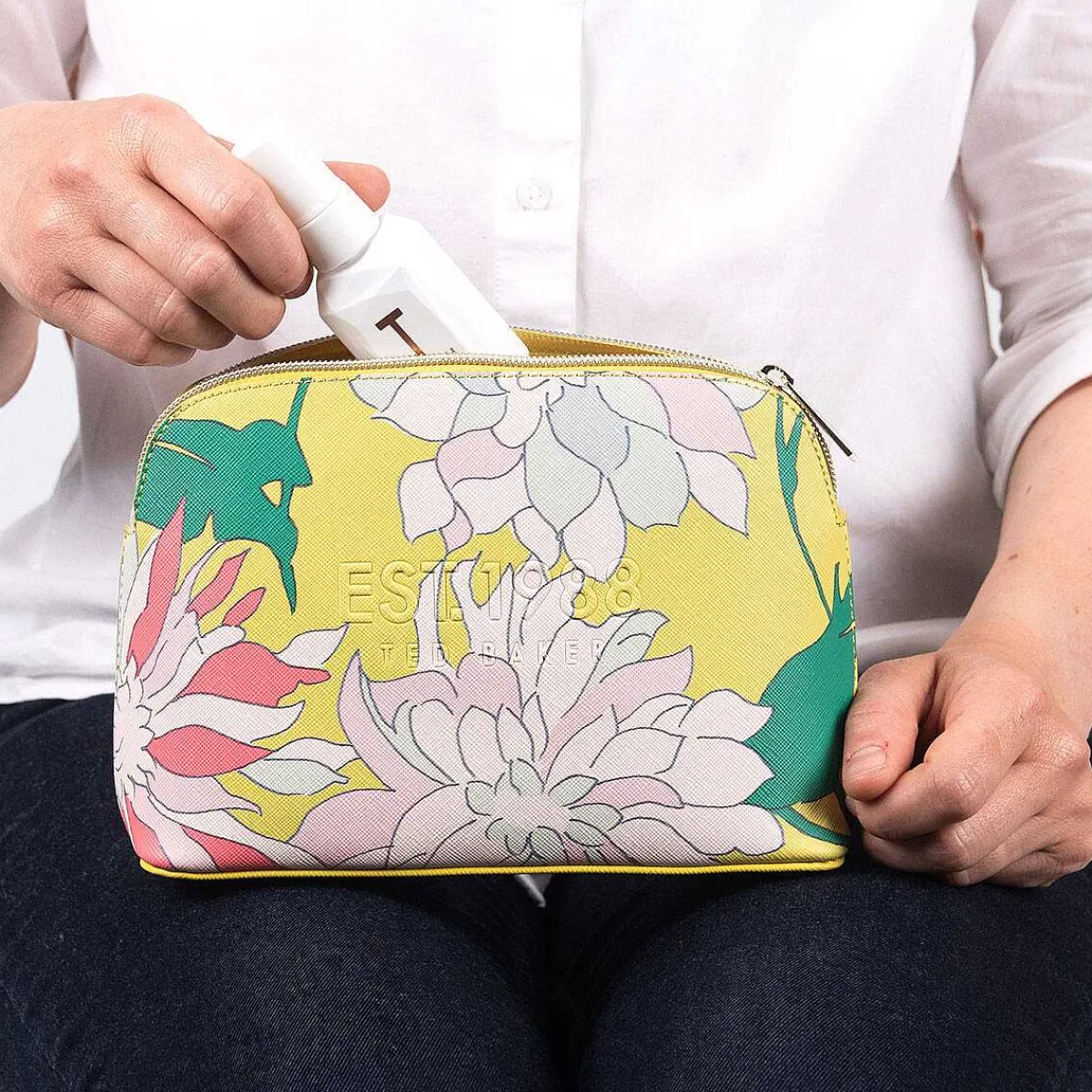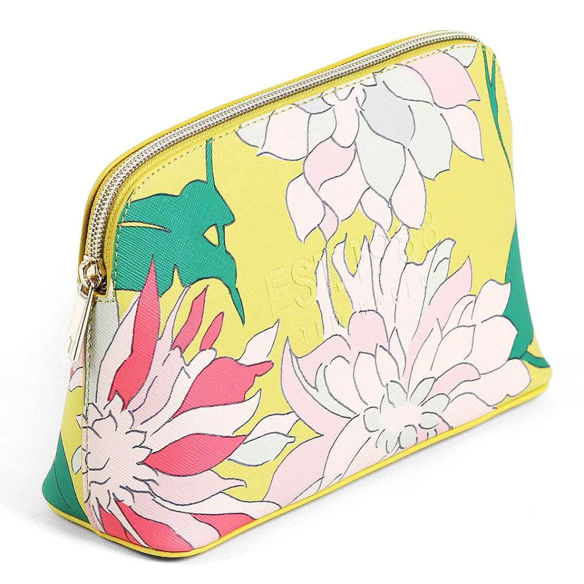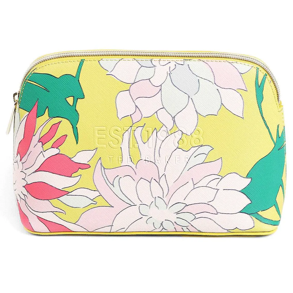 Made From Faux Leather With A Polyester Lining, This Make Up Bag Is Decorated With A Wonderful Floral Pattern Of Chrysanthemum Flowers In Pastel Pinks And Blues, With Green Leaves And Coral Pink Highlights. This Is All Set Against A Vibrant Lime-Yellow Background Which Makes This Design Simply Striking. Subtly Embossed Onto The Textured Exterior Is The Ted Baker Logo Along With The Date They Were Established Which Brings This Piece Together. The Gold External Metal Zip Has A Zip Pull That Is Embossed With The Ted Baker ‘T’, Adding A Luxurious Touch To The Design. The Interior Has A Sleek Pink Lining And Has Plenty Of Space For Everything You Need, From Lipstick To Foundation, Eyeshadow To Contour.