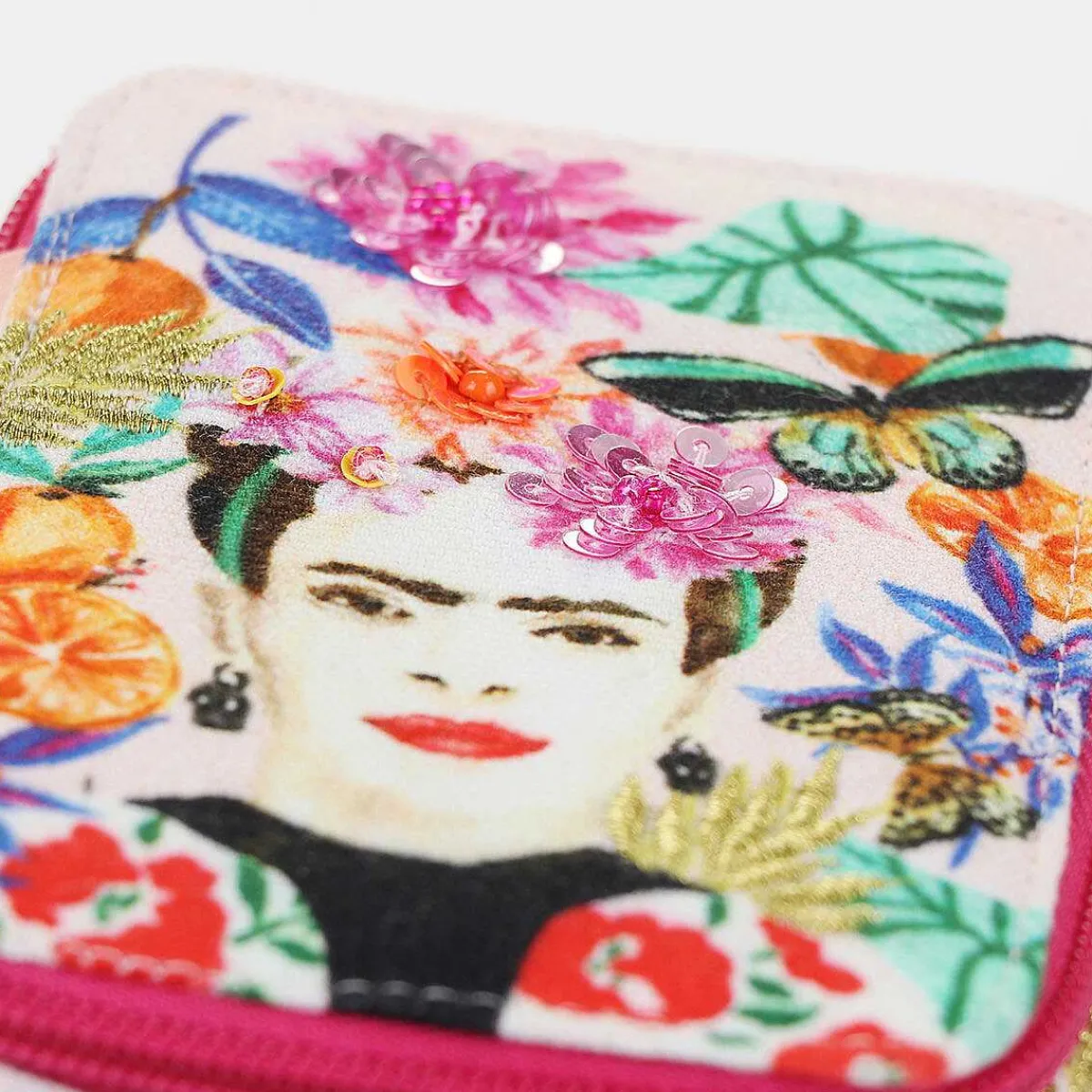 This Stunning Jewellery Case Is Decorated With An Image Of Frida Kahlo With Flowers In Her Hair And Surrounded With Fruits, Flowers, And Butterflies.
