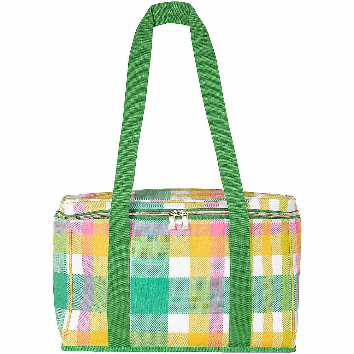The Bag Has Silver ‘stay-Cool’ Insulated Material Around The Interior And Two Nylon Webbing, And Green Handles For You To Carry It. The Exterior Of The Bag Is Designed In The Garden Plaid Print Which Features Squares Of Plaid In Shades Of Green, Pink, White And Yellow. The Bag Sealed With A White Gold Fastener With Two Zip Pulls That Meet In The Middle To Keep Your Snacks Safe.