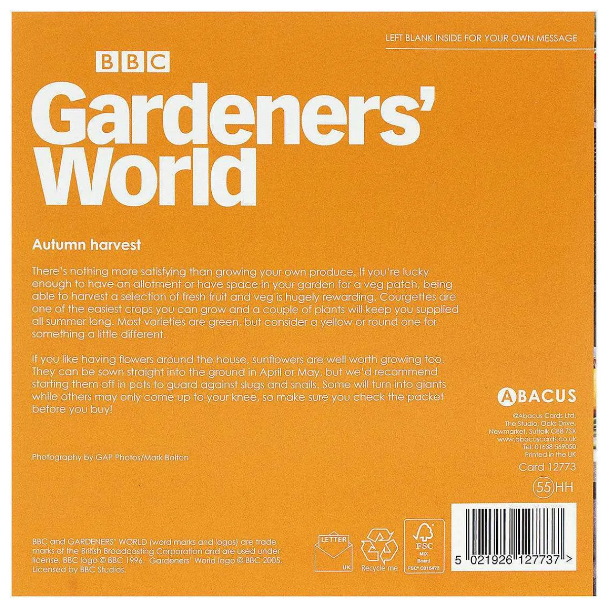 Abacus Cards Is One Of The Leading Greeting Card Publishers In The Uk. Priding Themselves On An Imaginative And Diverse Range Of Cards Made To A High Standard. They Started In 1991 As Mr Fothergill Seeds And Purchasing Art-Led Greetings Card Publisher Clare Maddicott Publications. Abacus Cards Have An Extensive Portfolio Of Over 1000 Designs Thanks To A Team Of Creatives In House And Freelance, Photographers And Illustrators Catering For Every Occasion. Including Ranges For Bbc Programmes; Country File, Gardeners World And Springwatch.