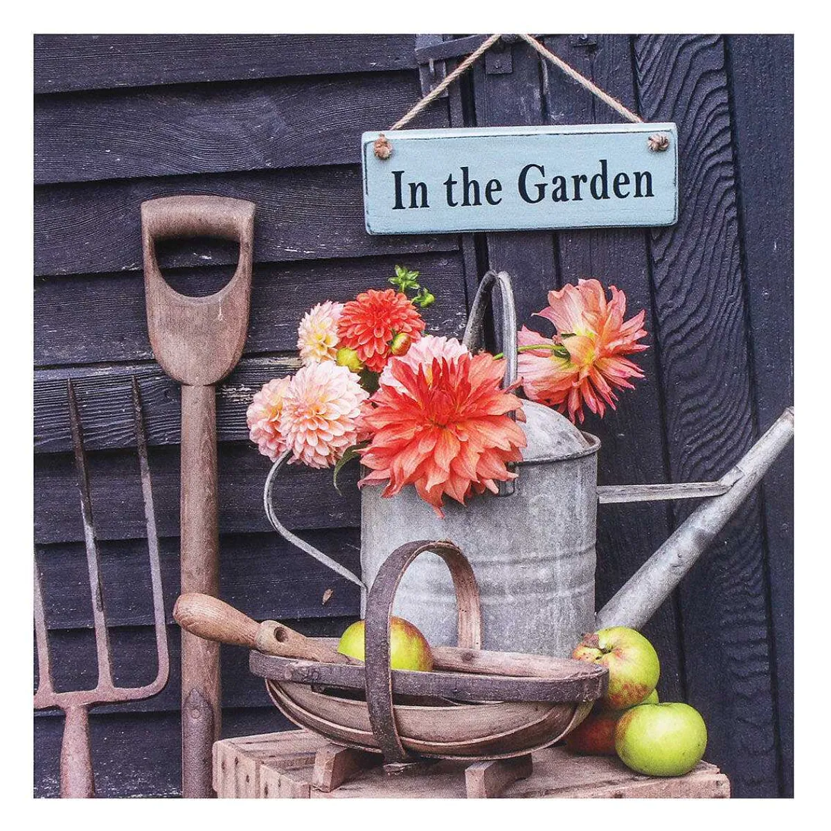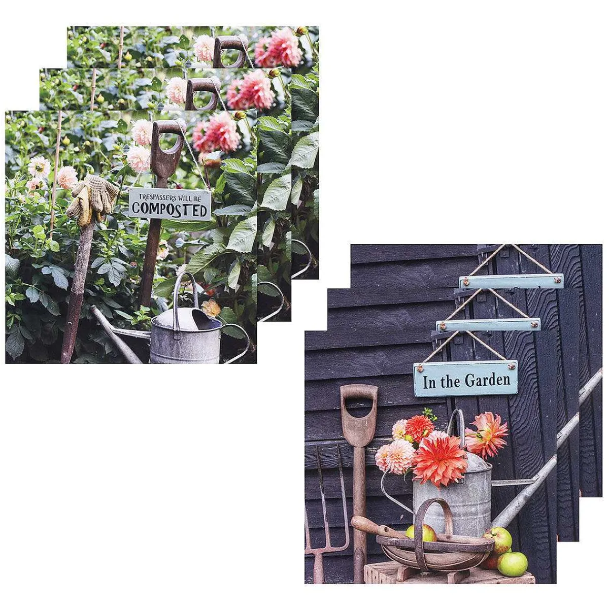 Inspired By The Bbc Programme Gardeners’ World; This Set Of 6 Note Cards Features Two Beautiful Gardening Photograph Designs. One Design Depicts A Gardeners’ View; A Metal Watering Can, An Old Spade With Gardening Gloves Perched On Top That Sits In Front Of A Bed Of Dahlia, Complete With A Traditional Fork With A Sign Hanging From It That Reads ‘Trespassers Will Be Composted’. The Second Design Features A Watering Can Filled With Dahlia Flowers, A Garden Trug With Apples And Some Old Tools Stood Against The Wooden Shed. Hanging From The Shed Door Is A Sign Which Reads; ‘In The Garden’.
