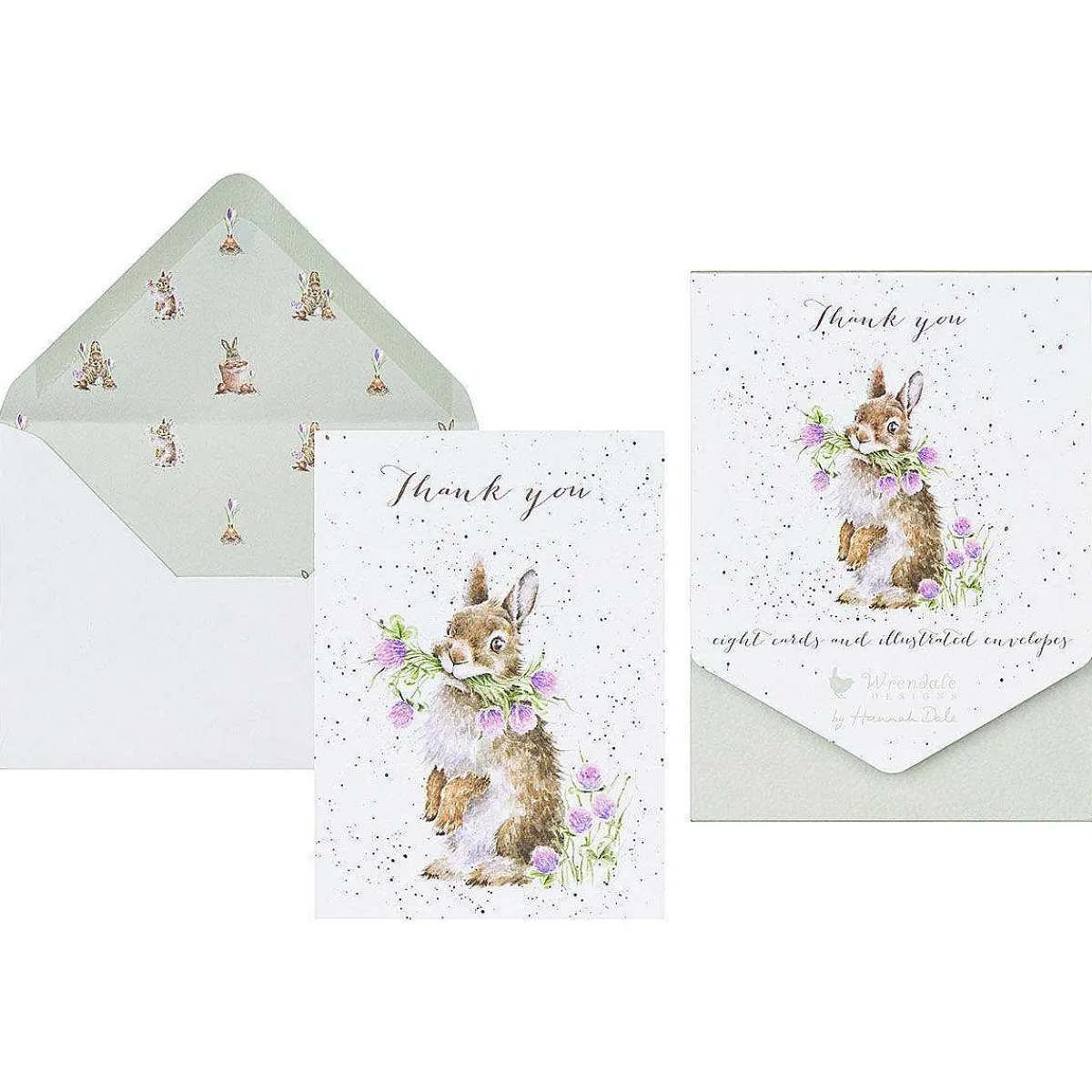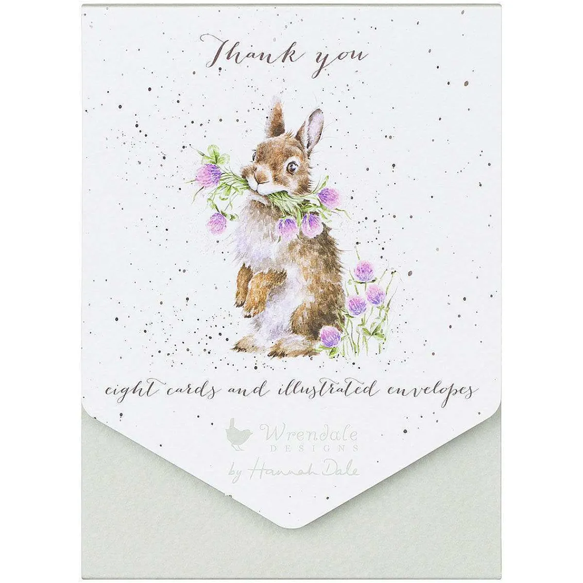 The Thank You Cards Each Feature A Beautiful Illustration Of A Fluffy Bunny Who Is Sat Up On His Hind Paws, His Mouth Full Of Purple Clover Flowers. The Bunny Covered In Gorgeous Fur With White And Brown Colourings Which Contrast Beautifully With The Luscious Greens And Purples Of The Flowers. Speckles Of Black Paint Created A Border Of The Paper, Giving A Classic Look That Is Synonymous Of A Wrendale Design . The Design Is Illustrated In The Watercolour Style That Is The Trademark Of Wrendale Designer Hannah Dale. This Is All Printed On Beautiful Textured Board That Gives A Crisp White Background For The Illustration. The Text Above The Illustration Reads ‘Thank You’.