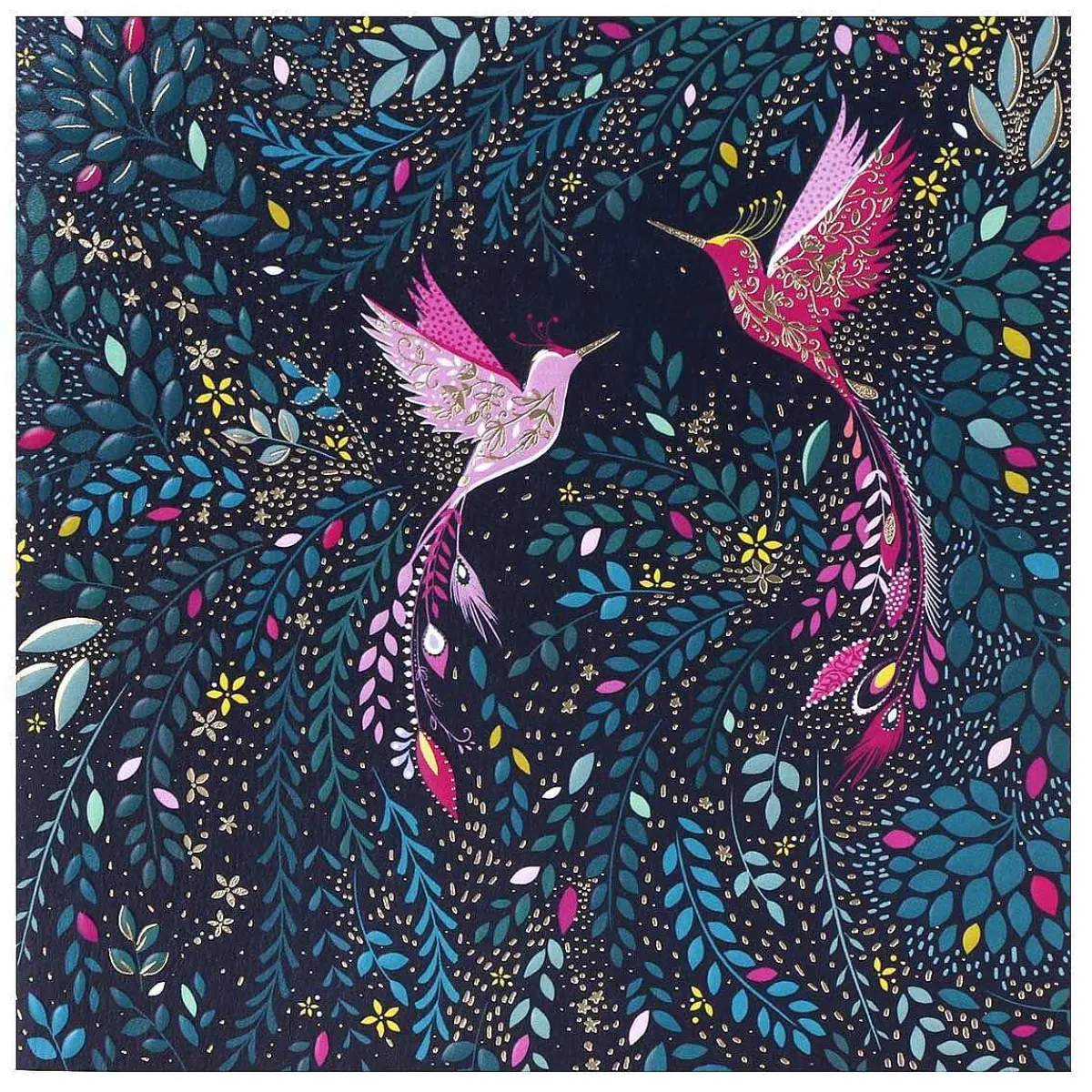 This Gorgeous, Gold Foiled Greetings Card From Sara Miller Features Two Majestic Pink Hummingbirds With Long Tails And Opulent Golden Patterns. The Birds Are Set Amongst A Cascade Of Green Foliage Against A Black Background Which Allows The Design To Stand Out.