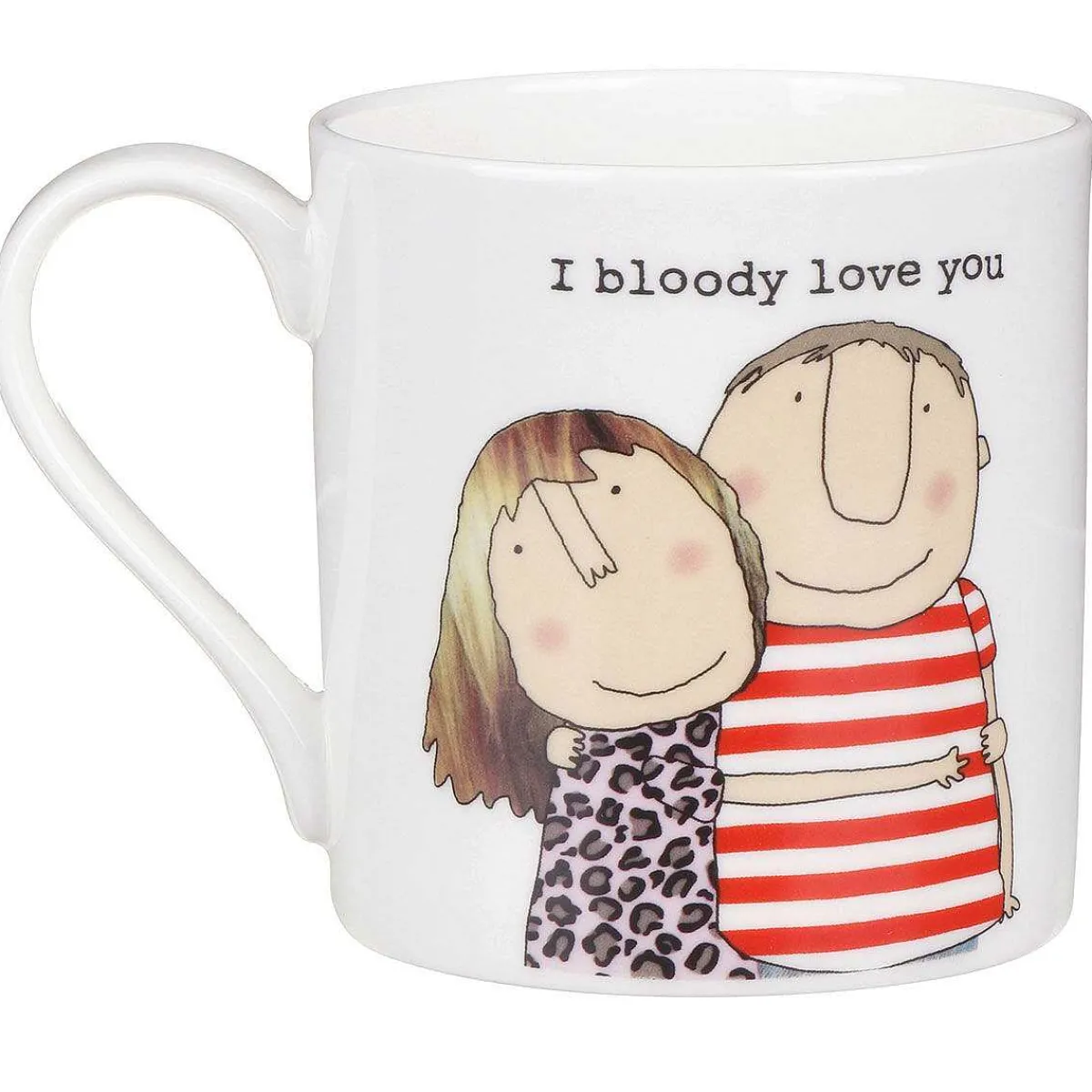 The I Bloody Love You Theme Features A Man Wearing A Red Striped T-Shirt And Woman Dressed In A Pink Patterned Top, Embracing In A Hug. The Adoring Phrase, In A Typewritten Font, Reads; ‘I Bloody Love You’. The Comical Illustration Repeats On The Reverse Allowing You And Your Friends To See The Design From Both Sides.
