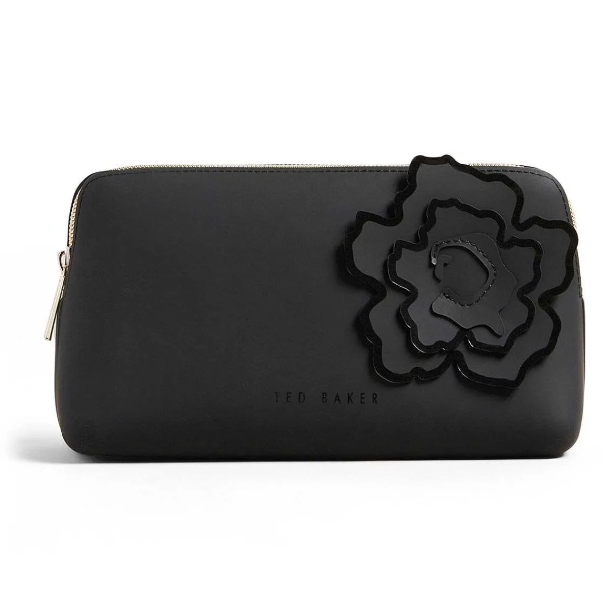 This Sleek Black Silicone Washbag Is Beautifully Decorated With A Sculptural ‘3D’ Magnolia Flower And Embossed With The Ted Baker Logo. Keep Everything Safe And Secure In Your Makeup Bag With The Gold External Zip Which Has A Zip Pull That Is Embossed With The Ted Baker ‘T’. The Interior Has Plenty Of Space For Everything You Need, From Lipstick To Foundation, Eyeshadow To Contour.