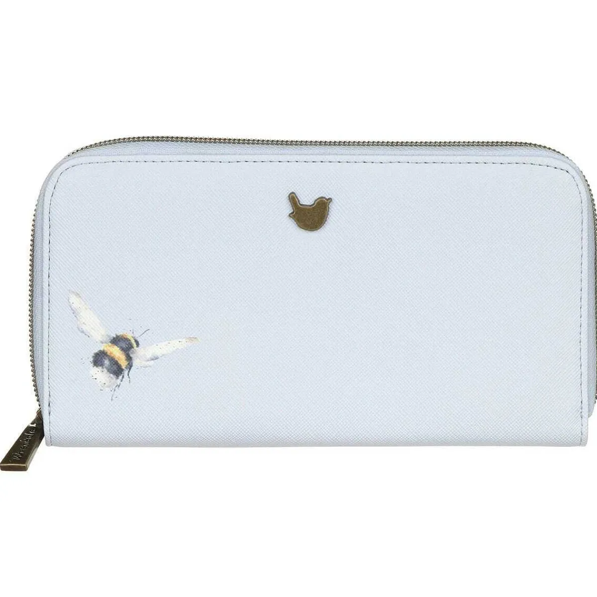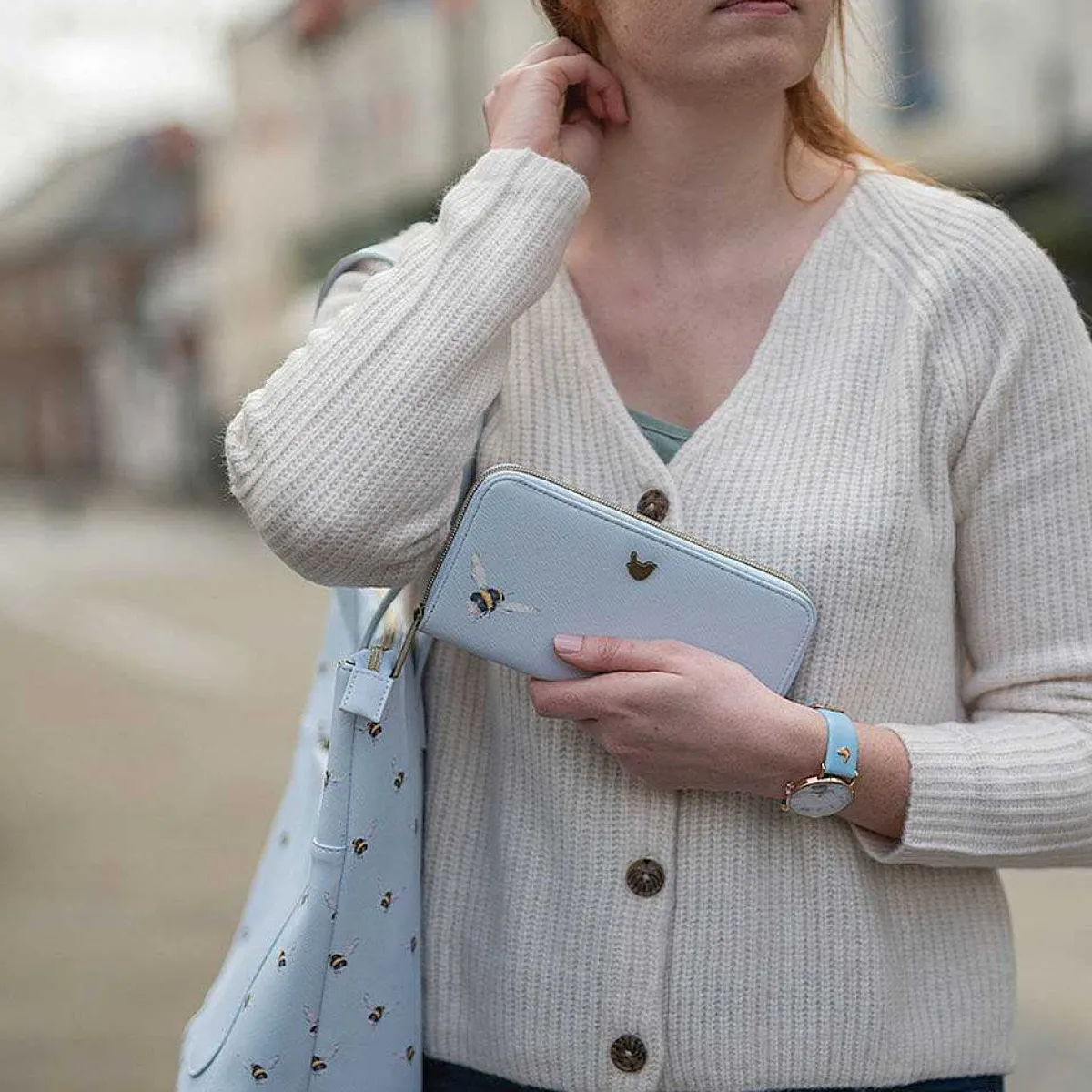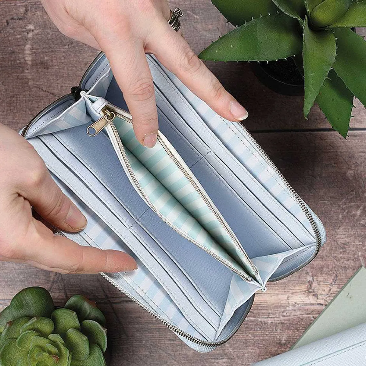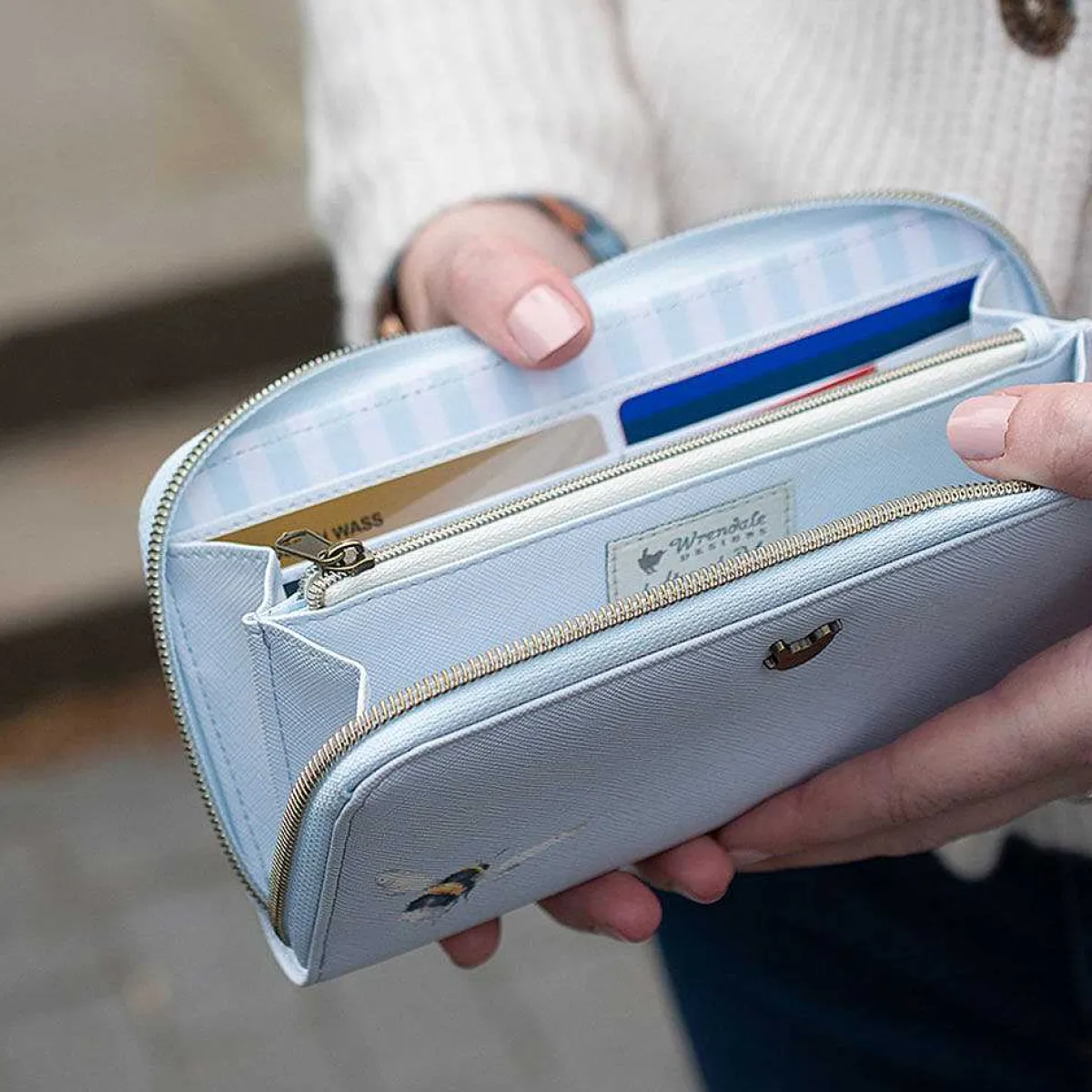 This Durable Purse Is Made From Faux Leather And Is A Beautiful Baby Blue Colour. It Features An External Metal Zip With A Zip Pull That Matches The Main Body And Is Accentuated With Bronze Hardware With The Signature Wrendale Designs Branding On The Front. The Concertina Design Of The Purse Opens To Reveal Printed Cotton Lining With A Blue And White Pattern And Has 8 Card Slots, A Zipped Coin Section And Space For Notes.