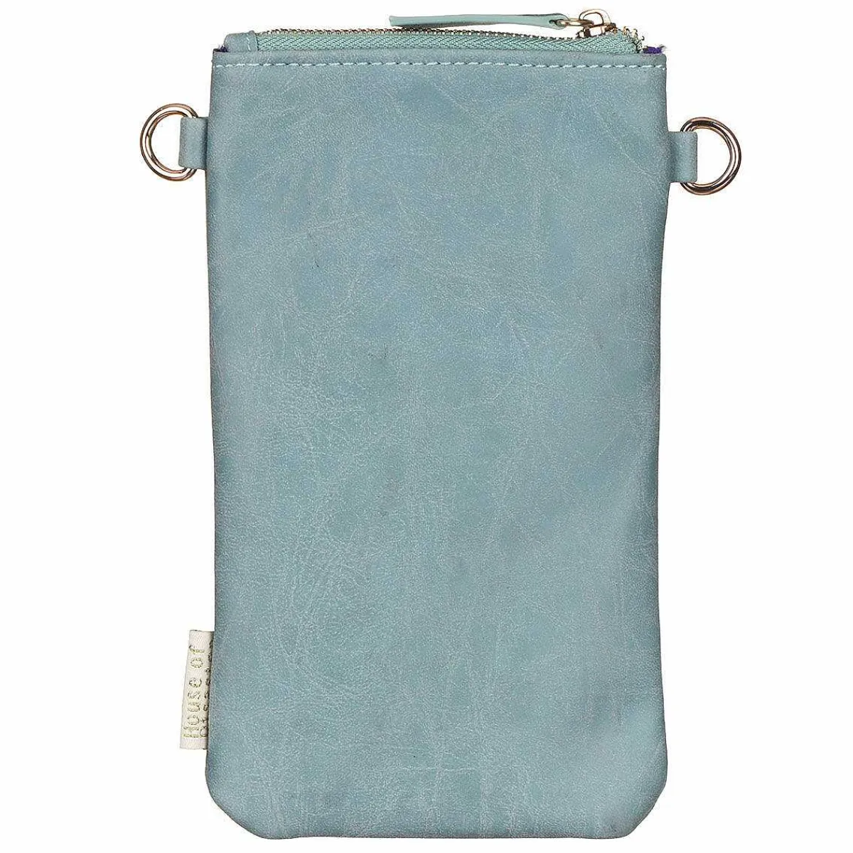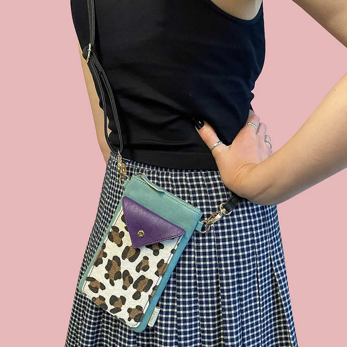 Made From Vegan Leather, This Animal Print Phone Wallet Bag Has Enough Space To Store Your Phone Along With A Few Little Essentials. The Main Body Of The Bag Is A Wonderful Soft Duck Egg Colour, And The Front Pouch Features A Leopard Print Design And Is Perfect For Housing Your Phone. There Is A Popper To Keep The Purple Front Flap In Place, Keeping Your Device Safe. The Zip Across The Top Opens The Main Section Where You Can Keep More Small Essentials, Such As Lip Balm, Your Keys Or Lip Gloss. There Are Also Two Gold Rings For You To Attach The Adjustable Strap To Wear Across Your Body, Or Alternatively You Can Carry The Bag As A Small Clutch Or Purse.