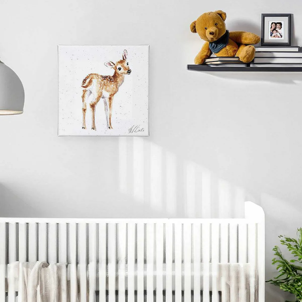 Set Against A Crisp White Canvas, This Painting Features An Adorable Fawn Looking Back On The Artist, Displaying Its Huge Eyes And Ears. The Overall Colour Pallet Is Calm And Gentle And The Intricacy And Detail Of This Piece Of Art Will Look Wonderful Hung On Any Wall. The Image Is Painted In The Soft Watercolour Style Of Hannah Dale, Finished With Her Trademark Paint Speckling.