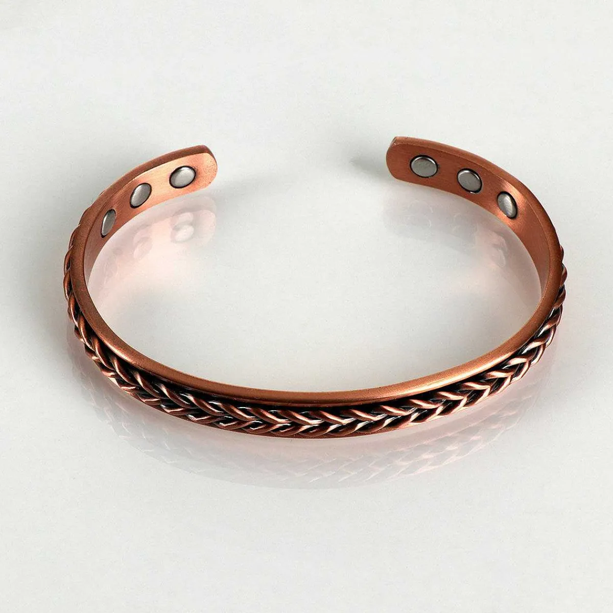With A Ribbed Plaited, Herringbone Effect Running Down The Centre Of The Band. Slip Your Wrist Through The Side Of The Bracelet And Twist It Around Into Place. This Bracelet Features 6 Magnet Points On The Inside, Thought To Ease Aches And Pains. The Stylish Copper Bangle Is A Simple Yet Bold Addition To Any Man’S Outfit.