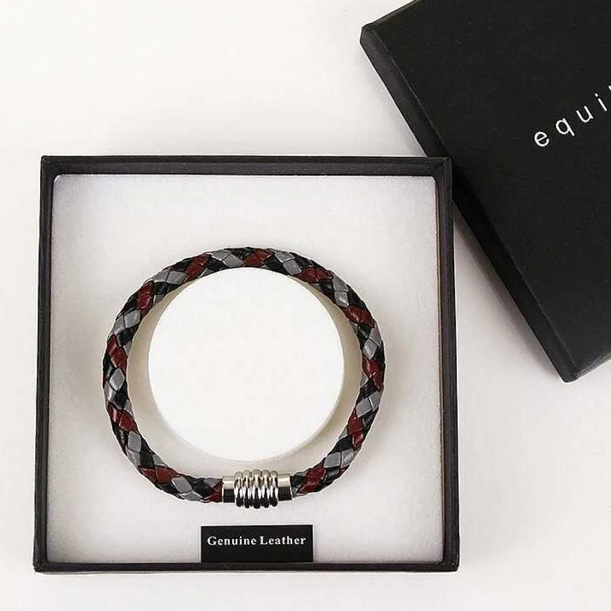 This Bracelet Is Made With Genuine Leather; The Magnetic Clasp Is Plated With Real Silver. The Leather Is Plait Into A Pattern They Are All Different Colours, Grey, Red And Black.