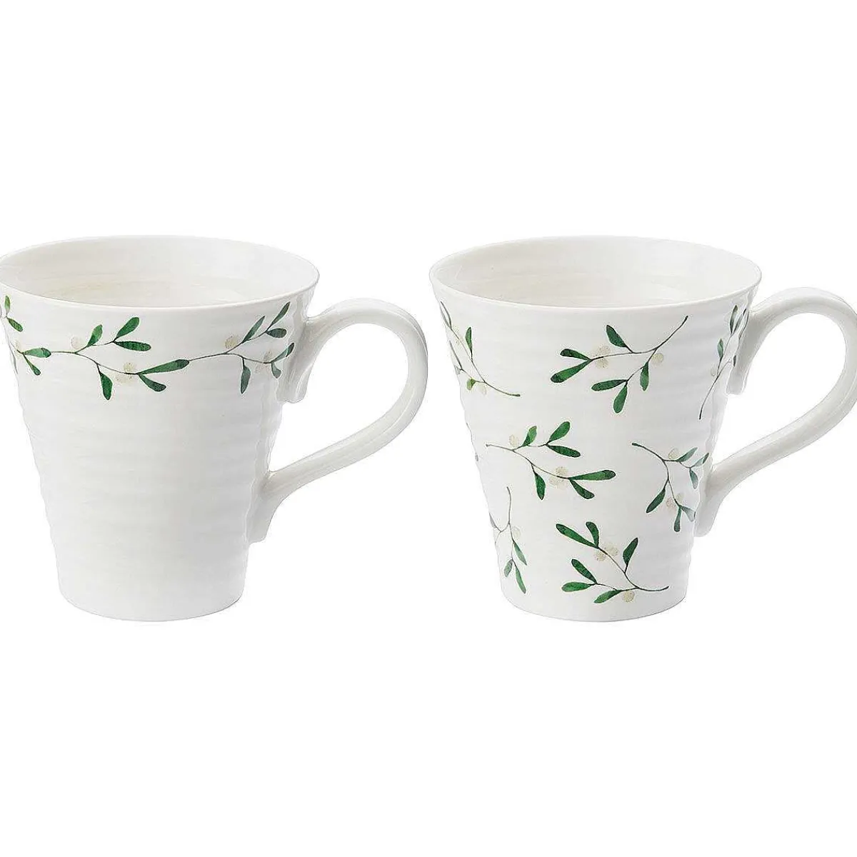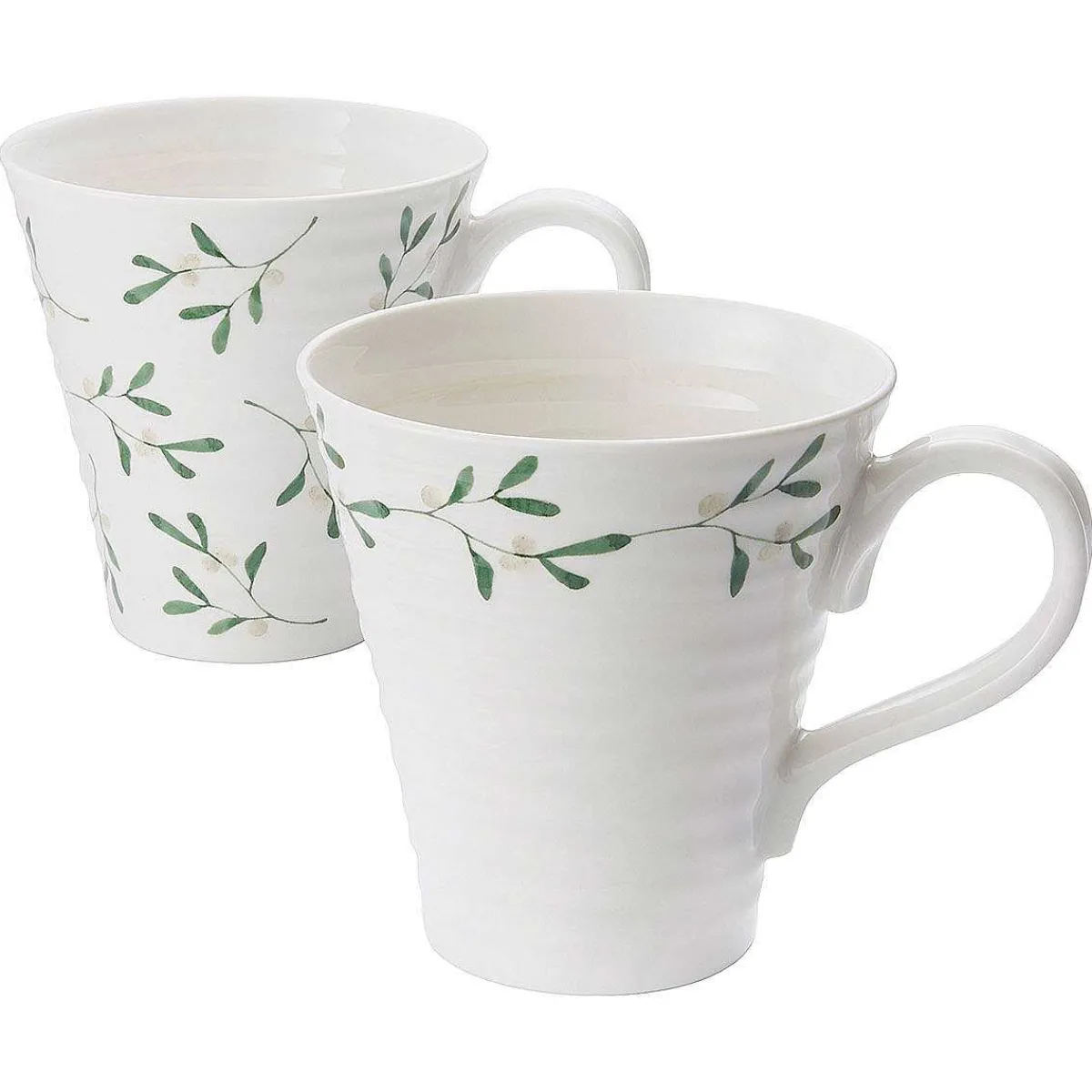 Made From Porcelain With A Tapered Shape, These Elegant, Festive Mugs Are Decorated With The Beautiful Mistletoe Design. One Mug Has The Mistletoe Scattered All Around The Exterior Of The Mug And The Other The Berry Plants Are Seen Around The Rim Of The Mug. The Gorgeous Greens And Whites Of The Berries And Leaves Look Stunning On The Crisp, White Ceramicware Which Is Formed With The Iconic Sophie Conran For Portmeirion Ripple, Giving A Handmade Feel.
