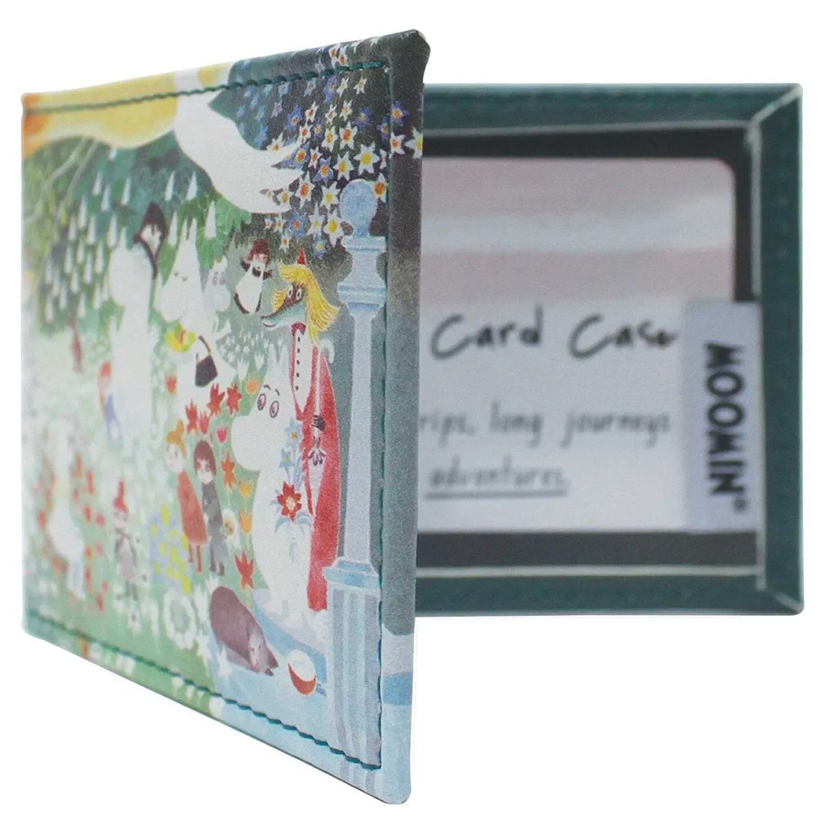 The Front Of The Cardholder Features A Beautiful Illustration Of The Characters Of ‘Moominvalley’. This Classic Image By Tove Jansson Shows A Variety Of Characters From The Beloved Moomin Stories, All Dancing Around The Woodland. Clusters Of Flowers And Leaves Contrast Against The Green Background And The Lush Foliage That Shows Spring Has Returned. The Image Is Faded With Bright White Tones Against Vibrant Colours Of Red And Mainly Green, As Were Most Of The Illustrations In This Famous Series Of Children’S Books. Inside Are Two Transparent Sleeves That Can Be Used To Carry Your Id And Travel Card Easily.
