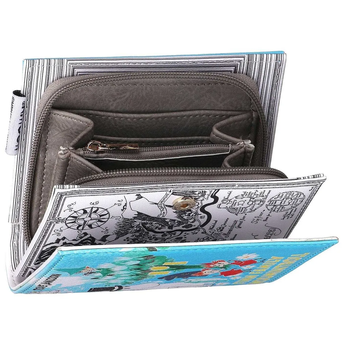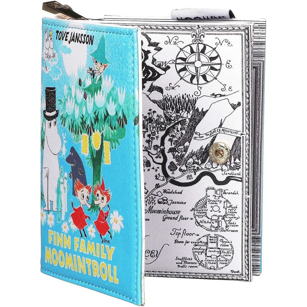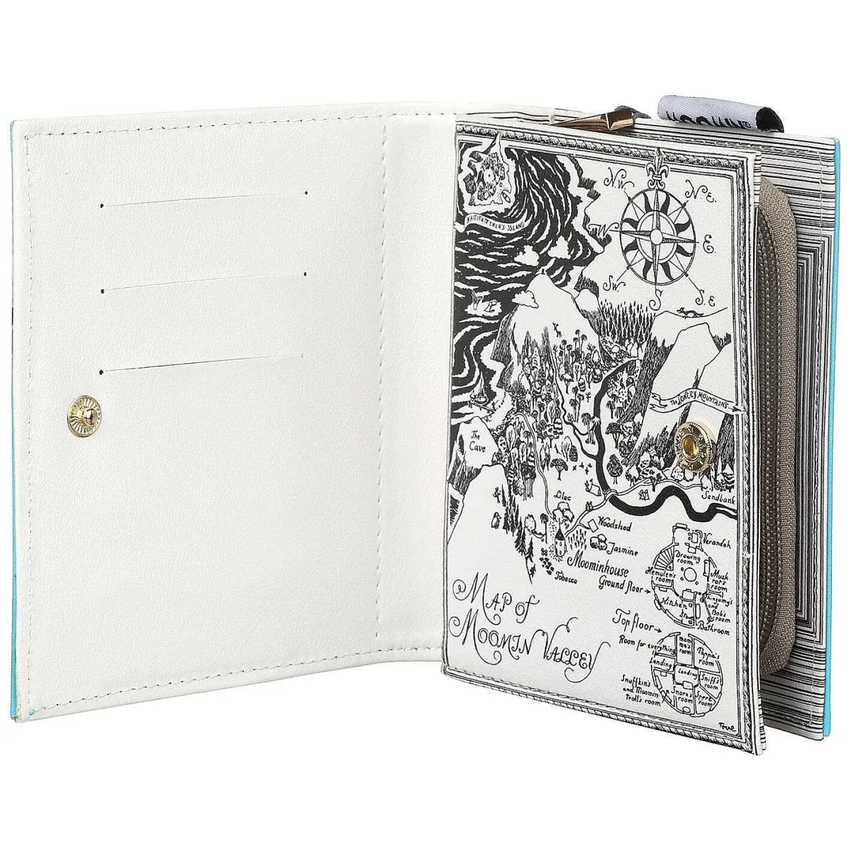 Underneath The Front Flap, Which Securely Closes Using A Magnetic Fastening Is A Black And White Labelled Map Of Moominvalley. As Well As A Map Of Moominvalley, In The Corner Is A Floor Plan Of The Moominhouse! It Is Lined With Cream Fabric And On One Side Has Space To Store Three Cards. Behind This Panel Is An Embedded Wallet Which Has A Zip To Keep The Content Safe. Inside The Wallet There Are Three Compartments, One Of Which Has A Zip To Keep Your Coins Safe. There Is Also Space To Keep Four More Cards And Two Slip Pockets For Receipts Or Notes. The Bag Comes With A Black Wrist Strap, Which Clips To The Zips Pull Tab.