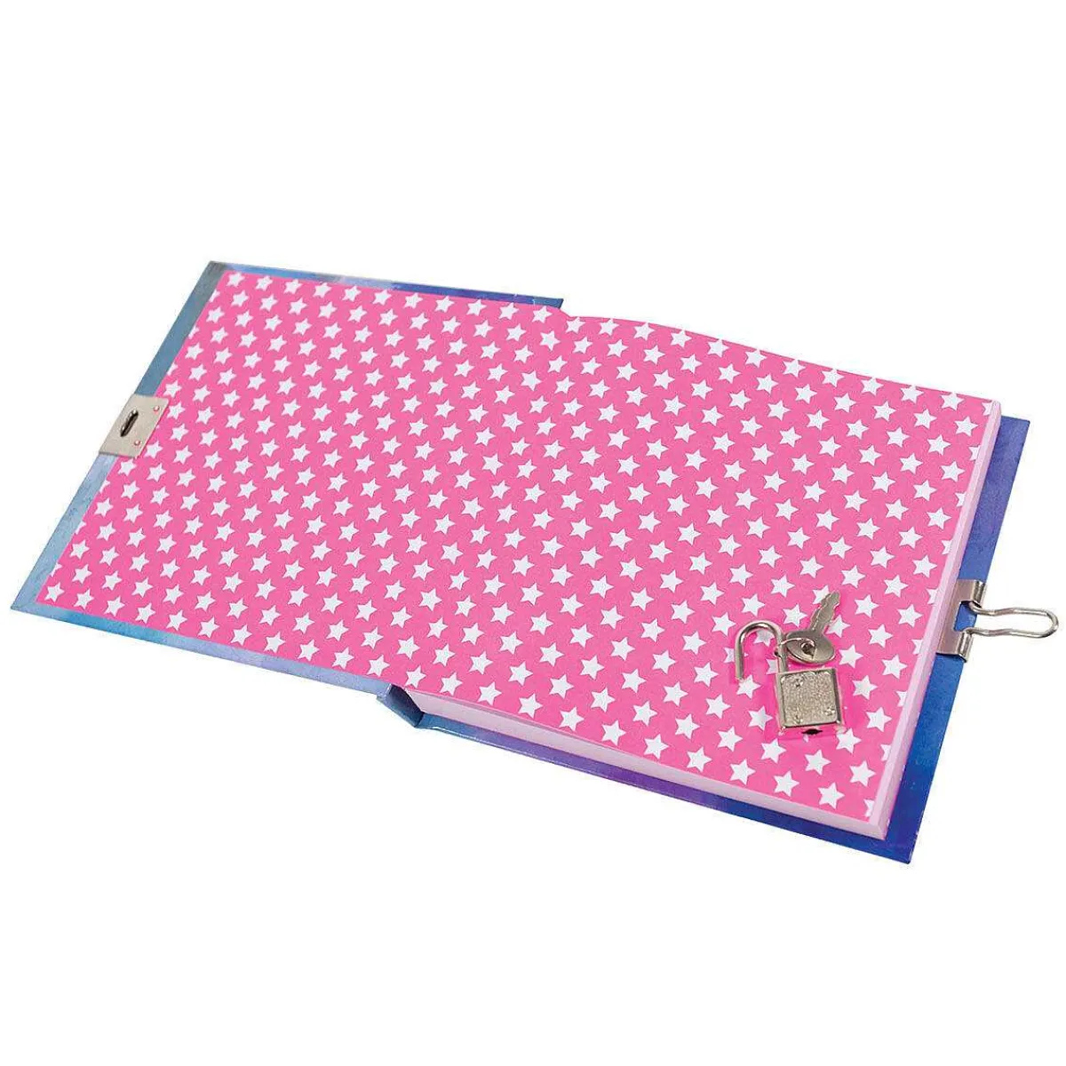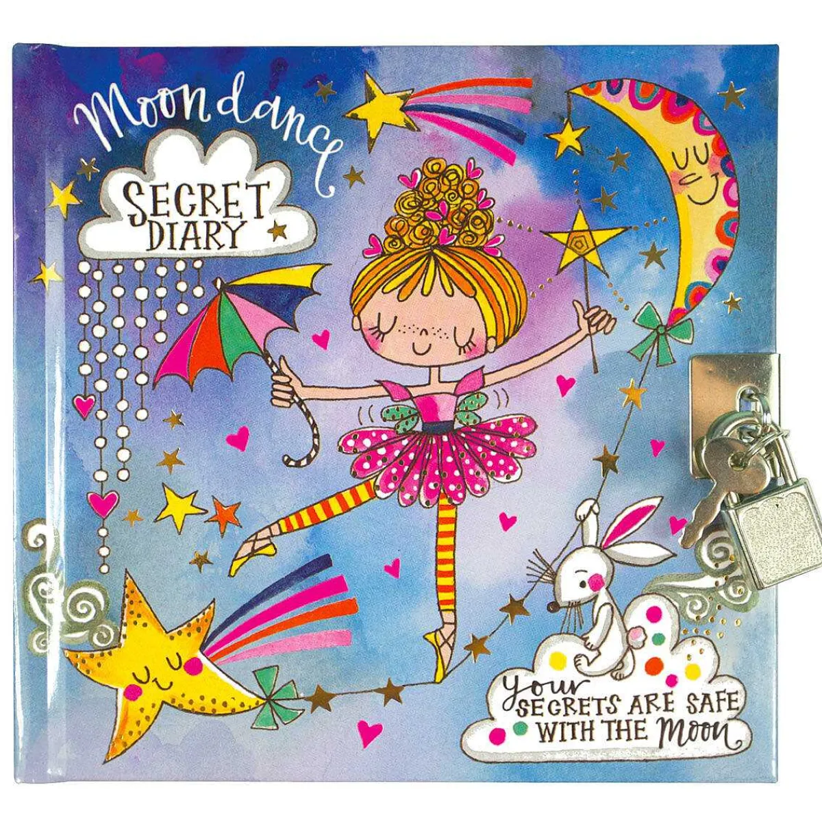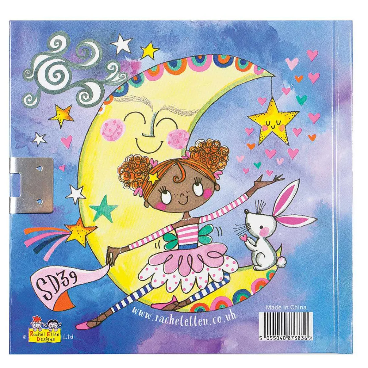Printed On A Blue Ombre Background, A Fairy Ballerina Is Poised Mid Dance, Holding A Star Wand And Umbrella. They Are Surrounded By Shooting Stars, A Cloud, And A Happy Moon. In The Top Corner Is The Title ‘Moon Dance’ Written In A Playful White Handwritten Font. The Cloud Has The Message ‘Secret Diary’ And Another Cloud At The Bottom Of The Design Reads ‘Your Secrets Are Safe With The Moon’. The Reverse Of The Diary Features Another Fun Illustration Of A Ballerina Dancing In Front Of A Large Smiling Moon. The Illustrated Design Is Complete With Gold Shimmering Details Which Adds To The Magical Scene. The Lined Pages Inside Are Pale Pink With A Small Illustration Of Hearts In The Corner. The Little Padlock Secures The Diary And Comes With Two Keys, Just In Case You Lose One!