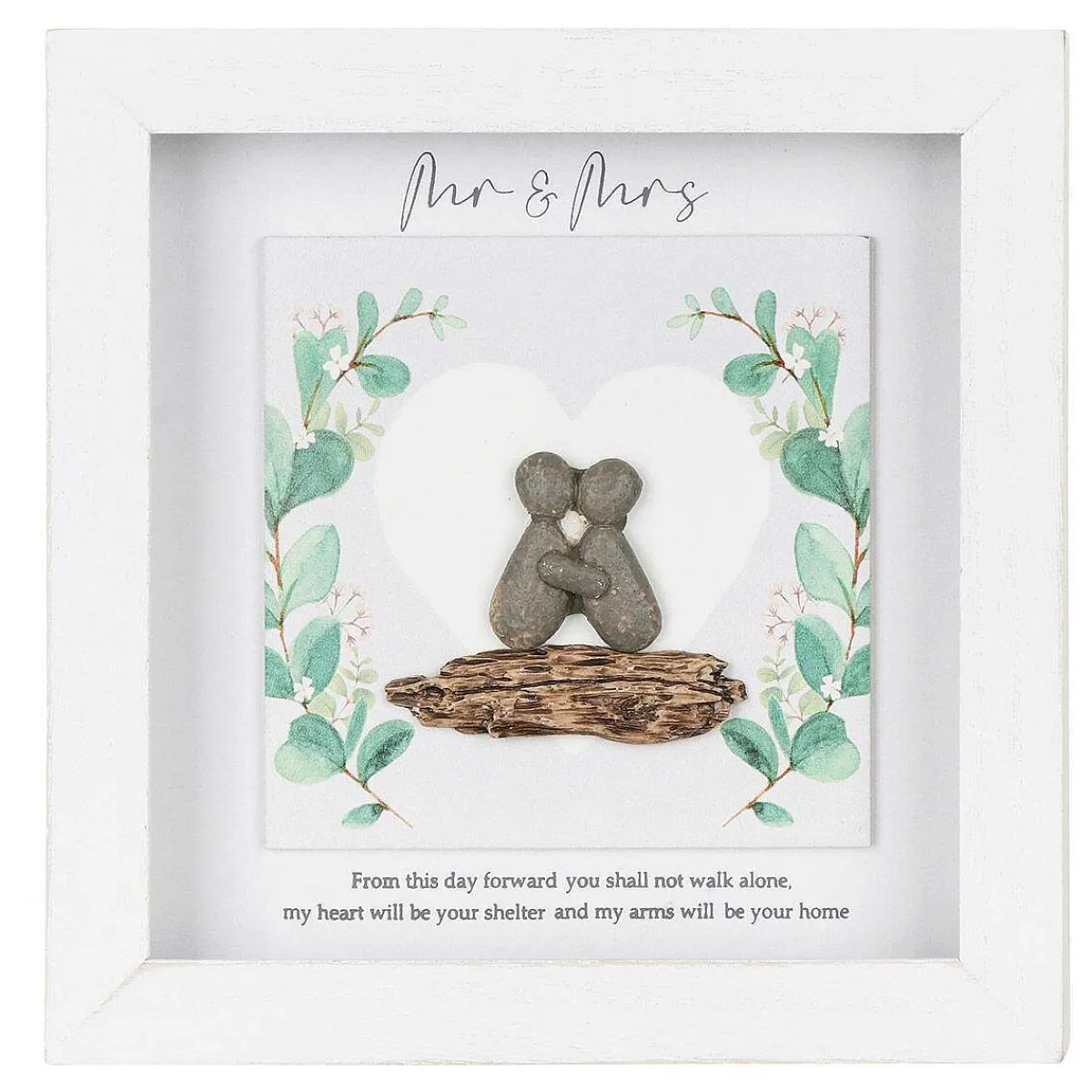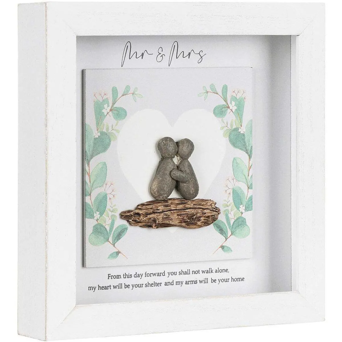 This Contemporary ‘Mr & Mrs’ Wooden Sign Is Embellished With Pebbles That Are Shaped Like A Bride And Groom Cuddled Together As They Kiss, Framed By A White Heart Backdrop, And Mounted Inside A Thick Box-Shaped Frame. Grey Typography At The Base Of The Sign Features An Inspirational Message That Reads, ‘From This Day Forward You Shall Not Walk Alone, My Heart Will Be Your Shelter And My Arms Will Be Your Home.’