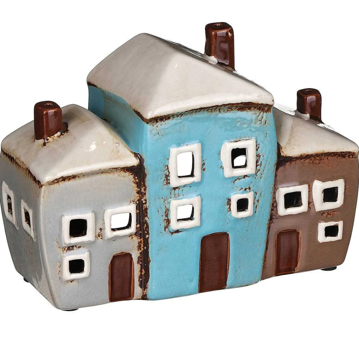 Featuring A Row Of Rustic Houses With A Grey, Turquoise, Terracotta And Cream Glaze, This Ceramic Tealight Holder Will Look Lovely When Displayed On A Shelf Or Windowsill. Place Tealights Of Your Choice Inside The Back Of The Houses To Watch The Windows Of The House Glow.