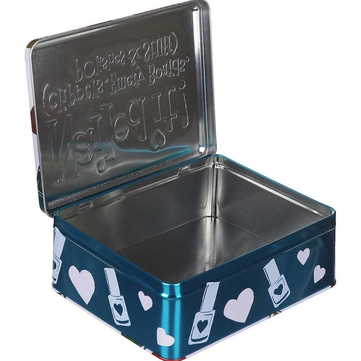 The Rectangular Tin Is Metallic Teal Around The Sides With A White Lid, Decorated With A Silhouette Of A Nail Polish Bottles And Hearts. Embossed In Vibrant Multi-Coloured Text On The Lid Are The Words: