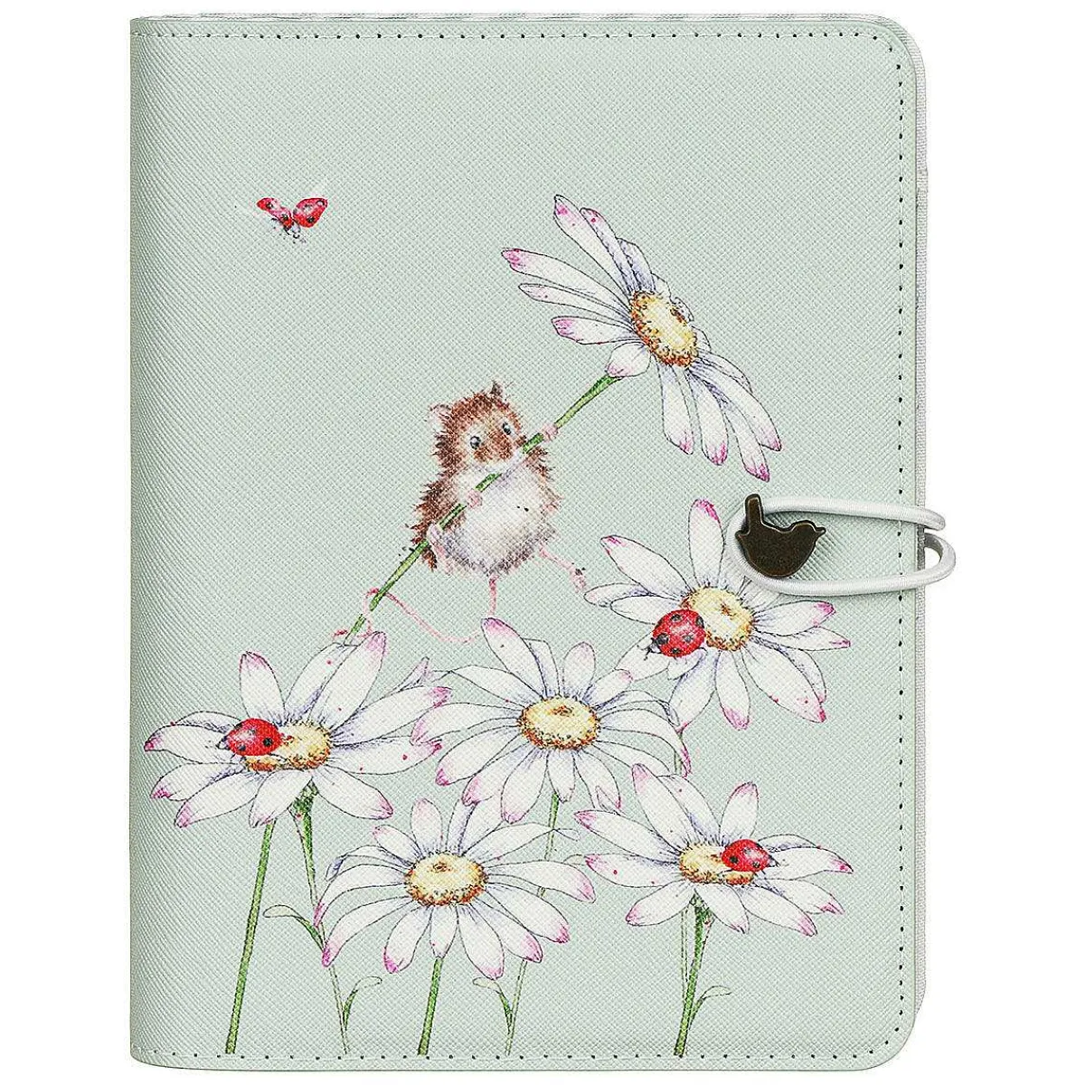 The Front Of This Organiser Is Decorated With An Adorable Field Mouse Who Is Attempting To Clamber Up And Nibble On The Stems Of Daisy Flowers Which Is Offset On A Pale Green Background. The Design Is Painted In A Soft Water Colour Style, With Intricate Detail And Surrounding It Is Speckles Of Black Paint, In A Way That It Very Synonymous With The Wrendale Brand. The Cover Is Made From Textured Vegan Leather, And It Can Be Secured Shut With An Elastic That Wraps Around A Brushed Bronze Wren.