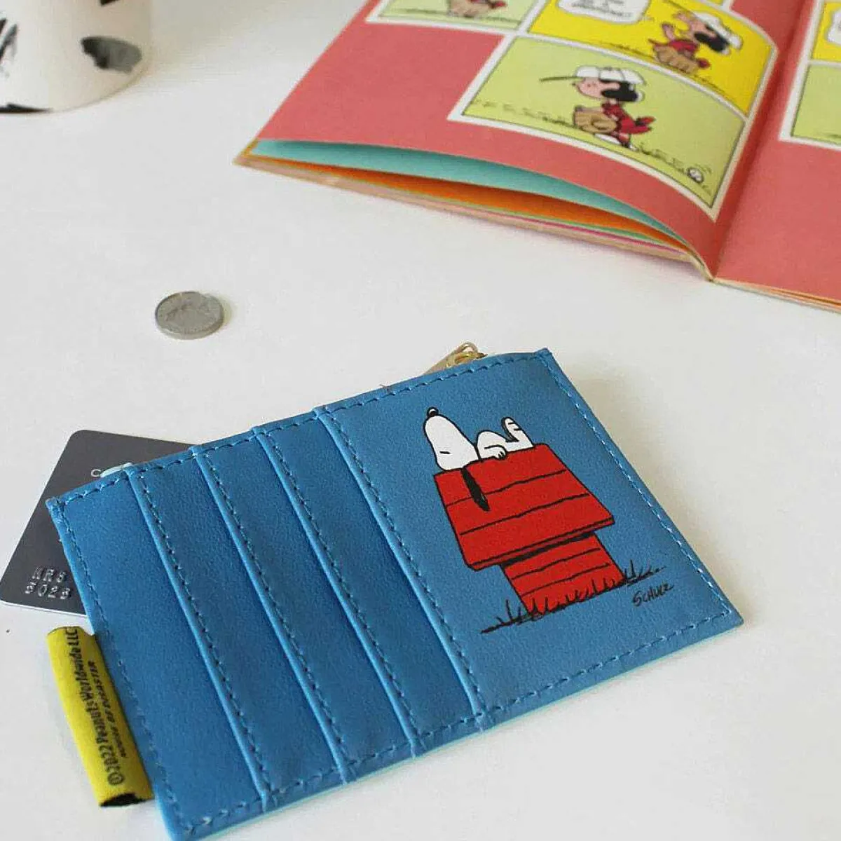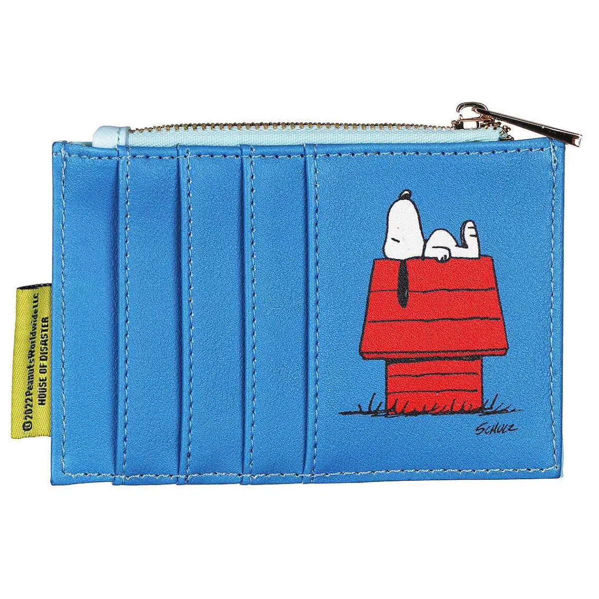 The Purse Features A Zip Compartment For Keeping Your Loose Change Safe Inside Along With 4 Slots To Keep Your Cards In. The Card Slots On The Back Of The Purse Are Blue Accompanied By An Illustration Of Snoopy Lying On His Red Kennel. The Purse Fastens Securely Using A Gold Zip Which Has A Gold, Metal Pull Tab.