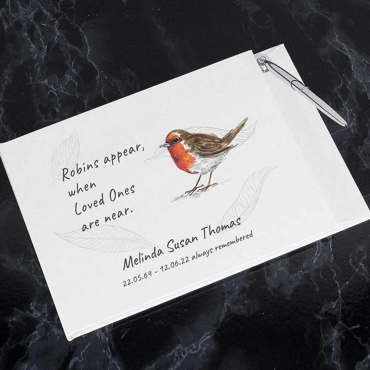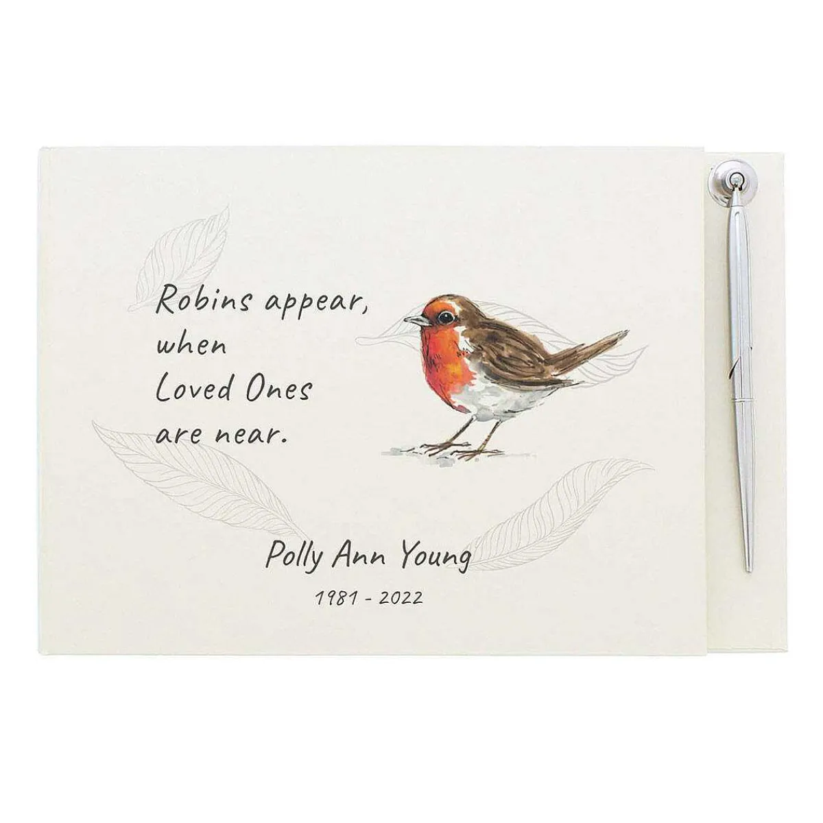 This Heartfelt Book Of Condolence Features A Soft Linen Texture Hardback Cover Adorned With A Beautiful, Red-Crested Robin And The Heartfelt Words, ‘Robins Appear When Loved Ones Are Near’.