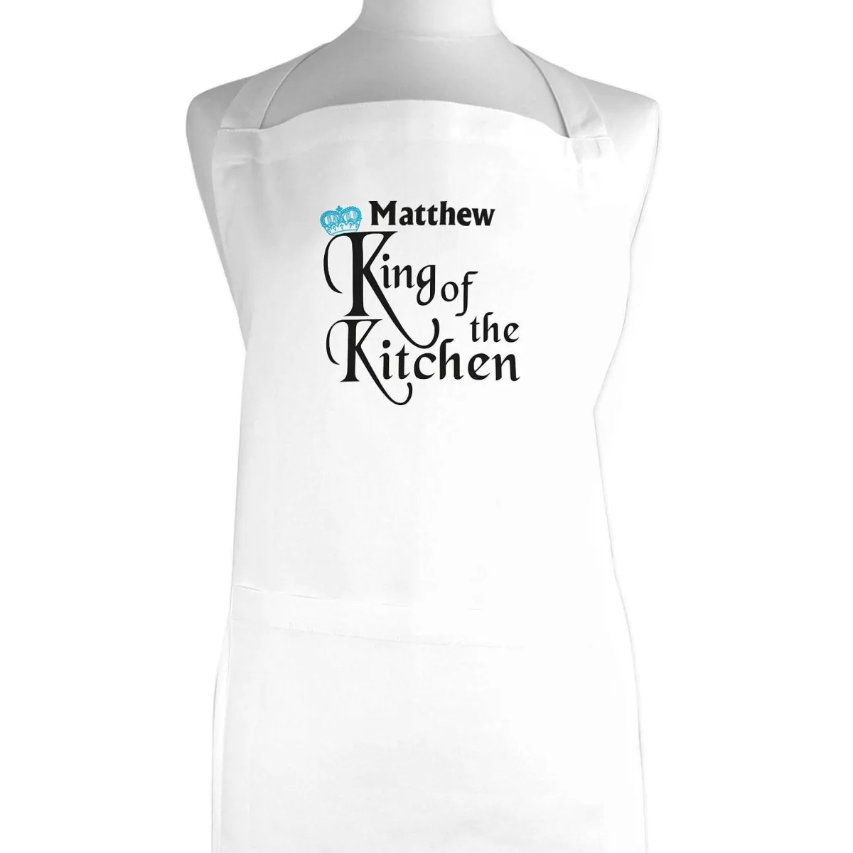 Made From A Polycotton Mix, The Apron Is White In Colour And Features The Phrase, ‘King Of The Kitchen’ In Black. Cursive Font, With A Little, Blue Crown On The Top Of The ‘K’.