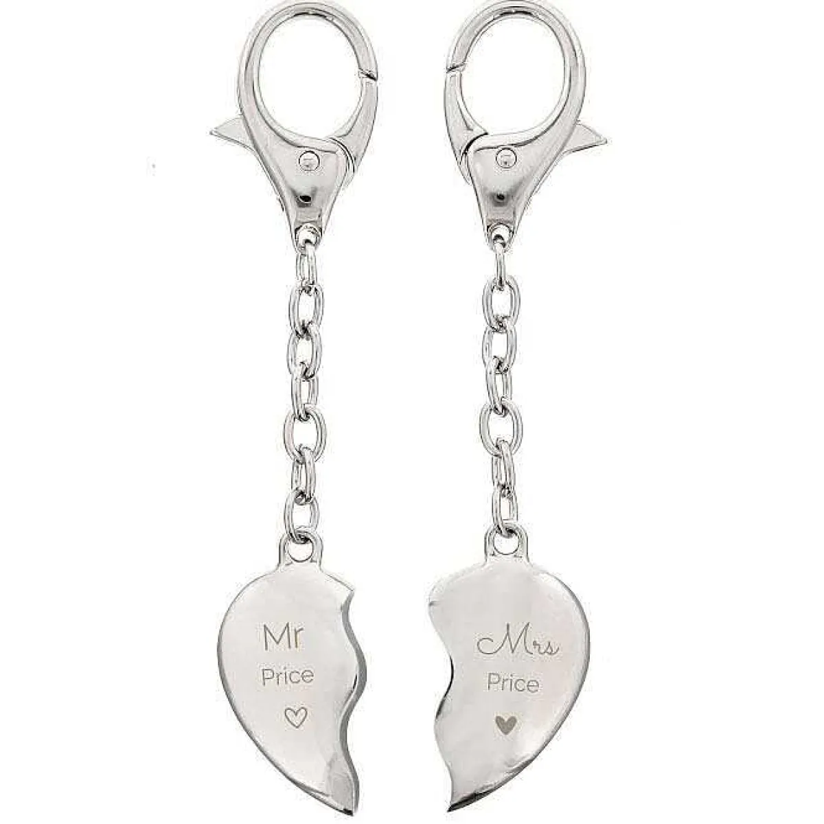 The Keyrings Are Nickle Plated And Designed In The Shape Of Two Halves Of A Heart, Which When Put Together, Form A Whole Heart! Both Keyrings Can Be Personalised With Your Surname, Which Will Appear Below ‘Mr’ On One And ‘Mrs’ On The Other.