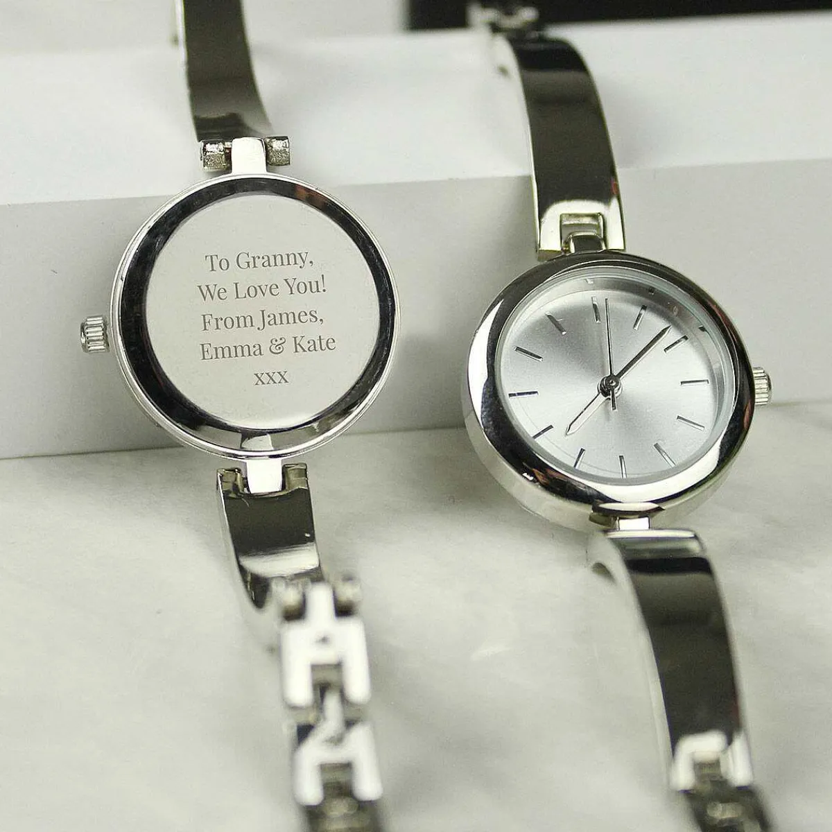 This Elegant Personalised Silver Ladies Watch With A Silver Slider Clasp Is A Perfect Gift For That Special Someone.