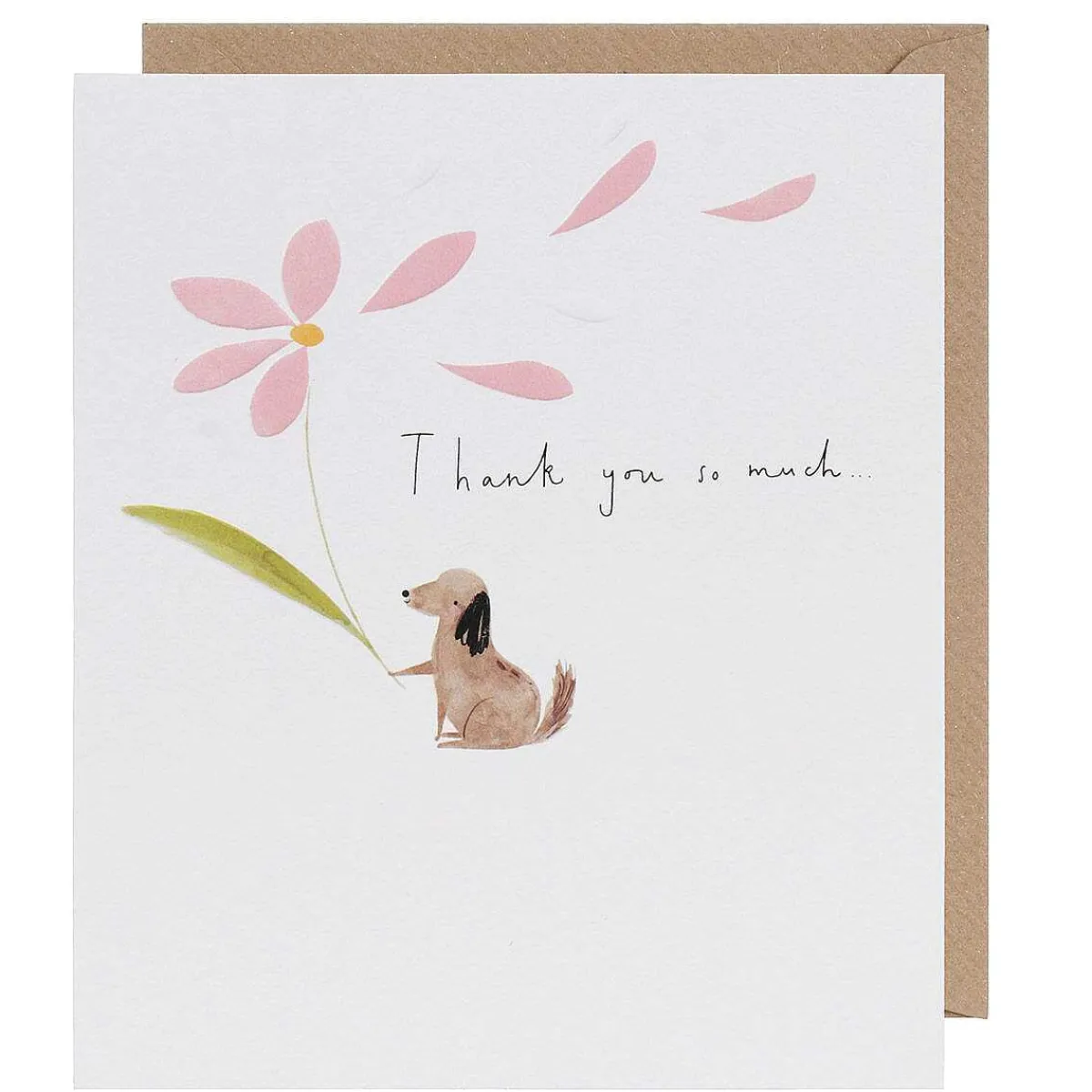 Featuring An Adorable Illustration Of A Small Brown Dog Holding A Tall Pink Flower, The Petals Of The Flower Are Blowing Away In The Wind. The Card Has Text Which Reads āThank You So Muchā¦ā Written In A Handwritten Font.