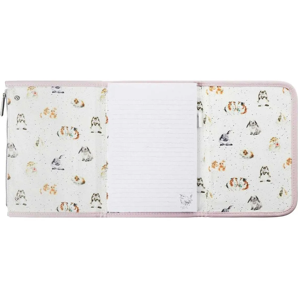 Inside The Wallet Is Split Into Three Sections. On The Left Is A Secure Zipped Pouch That Is Perfect For Storing Any Pens, Pencils Or Some Cash And In The Middle Is An Illustrated Jotter Pad Which Features A Simple Illustration Of Wren In The Bottom Corner And A Loop, So You’Re Never Caught Without A Pen. The Interior Is Decorated With A Pattern Of Wrendale Designs Set Against A White Background With Black Speckles. The Illustrations Include Adorable Bunnies And Fluffy Guinea Pigs.