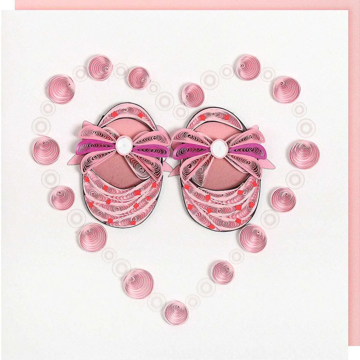 An Incredible Feat Of Paper Engineering, This Gorgeous 3D Card Looks Fabulous From Every Angle. It Features Layers Of Quilled Card That Has Been Meticulously Rolled By Hand To Create An Intricate 3D Design Depicting A Pair Of Adorable Baby Girl Shoes In Pink, Framed Inside A Patterned Heart Border On A Textured White Background.